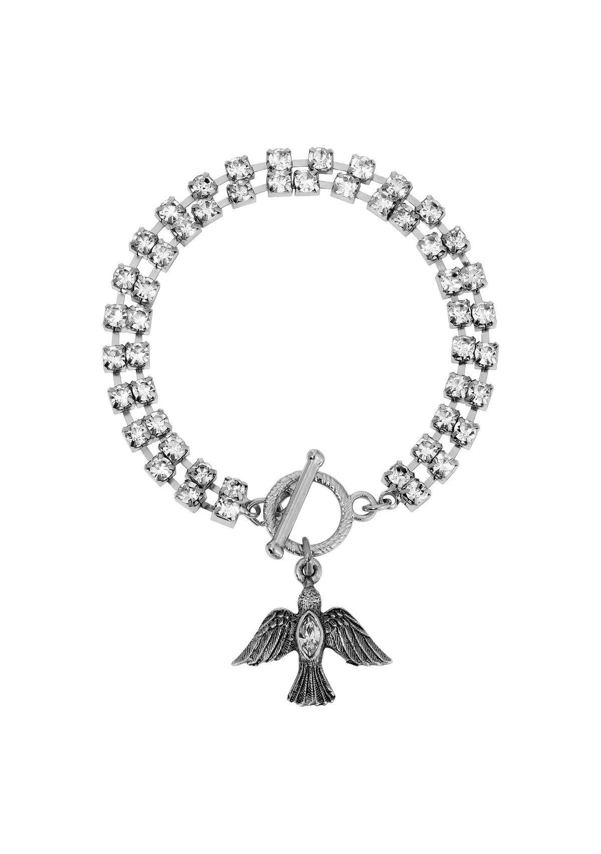 Add a touch of faith and elegance with the Symbols of Faith Silver Tone Crystal Dove Charm Bracelet. This two-row rhinestone bracelet features a sparkling dove of peace charm and a secure toggle closure. Perfect for everyday wear, spiritual inspiration, or a meaningful gift. Ideal for charm bracelet lovers and faith-based jewelry collectors. Length 7 in., width 7mm.