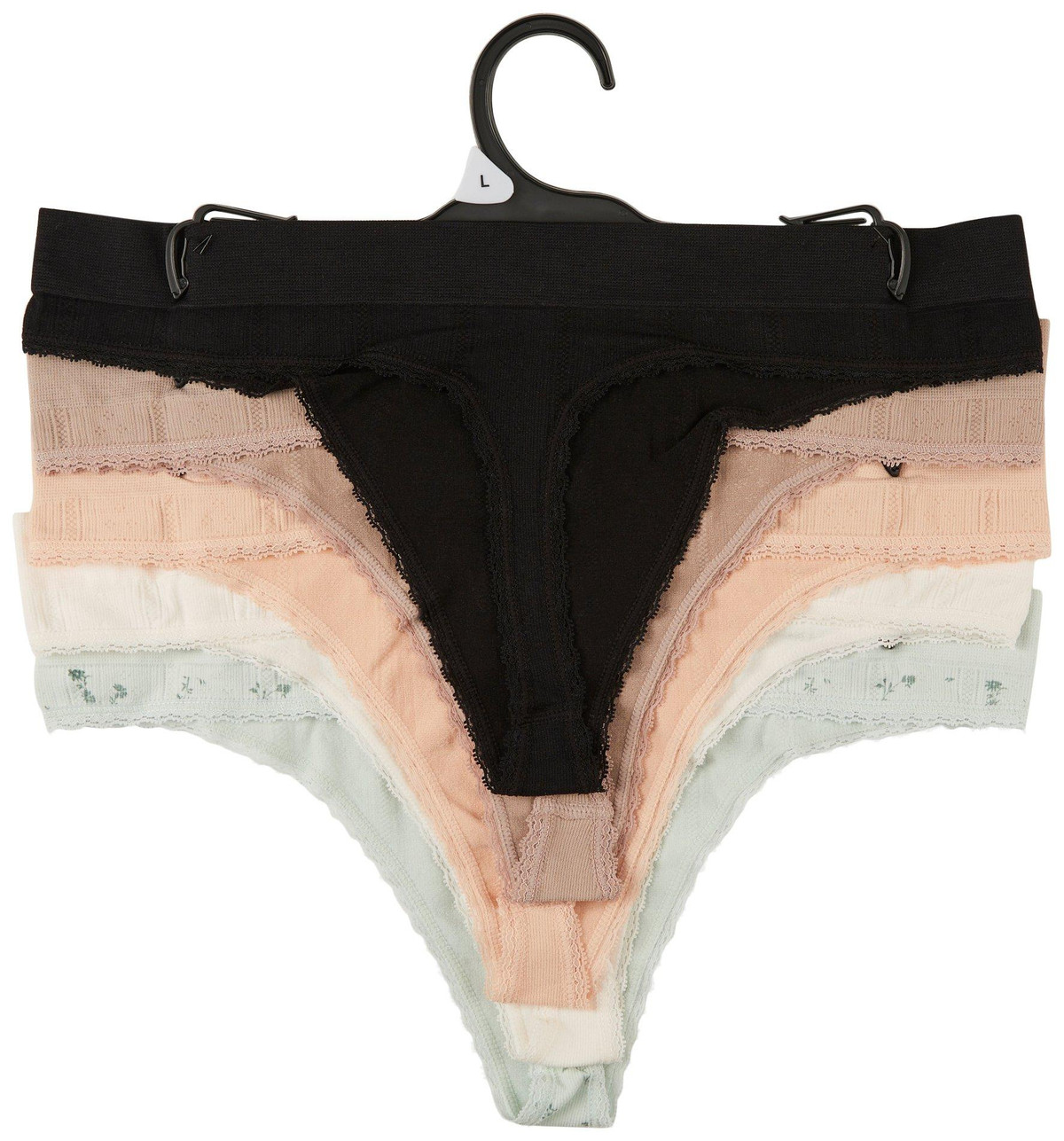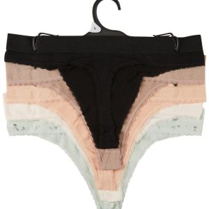 Upgrade your lingerie collection with our Women’s 5-Pack Seamless Thongs. Made from a soft blend of nylon and spandex, these thongs offer a comfortable and flexible fit. Featuring assorted colors and designs, each pair is adorned with a delicate lace trim for an added touch of elegance. The seamless construction ensures no visible panty lines, making them perfect for any outfit. These thongs are a stylish and practical addition to your wardrobe.