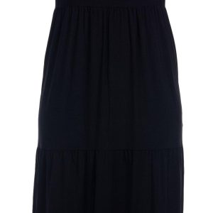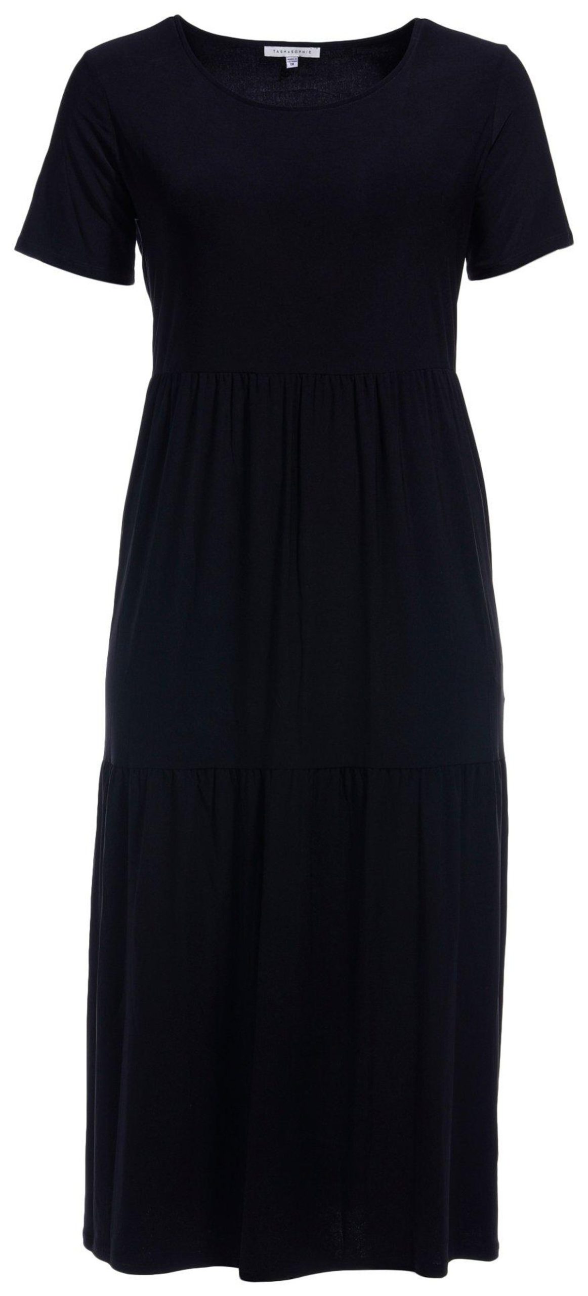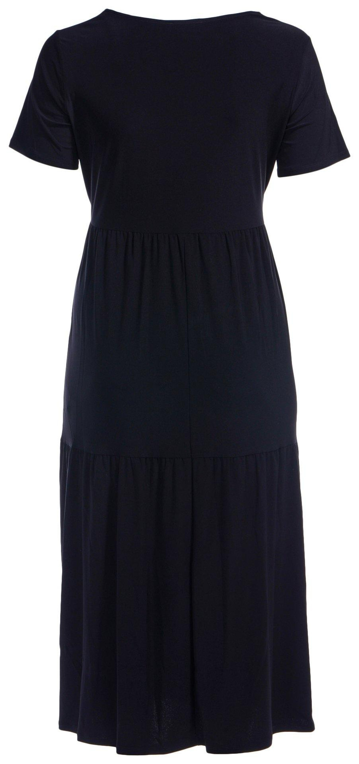 Discover casual elegance with this short sleeve tiered midi dress, featuring a chic solid color design on soft lightweight fabric, a short hemline and a relaxed fit. Perfect for dinner out, a day at the office or weekend shopping trips, this dress effortlessly combines comfort and style. Fabrication is 95% Polyester, 5% Elastane. Dress length measures approximately 51 in.