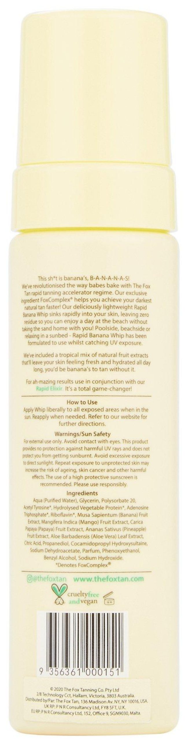 Soak up some sun at the beach for a darker real tan without taking the sand home with you! This deliciously lightweight Rapid Banana Whip is specially formulated to rapidly speed up your natural tanning process when chillin by the beach, poolside, or in a sunbed! The active ingredient dramatically increases melanin production. More of this means youll achieve a deeper and darker tan with less time in the sun!
