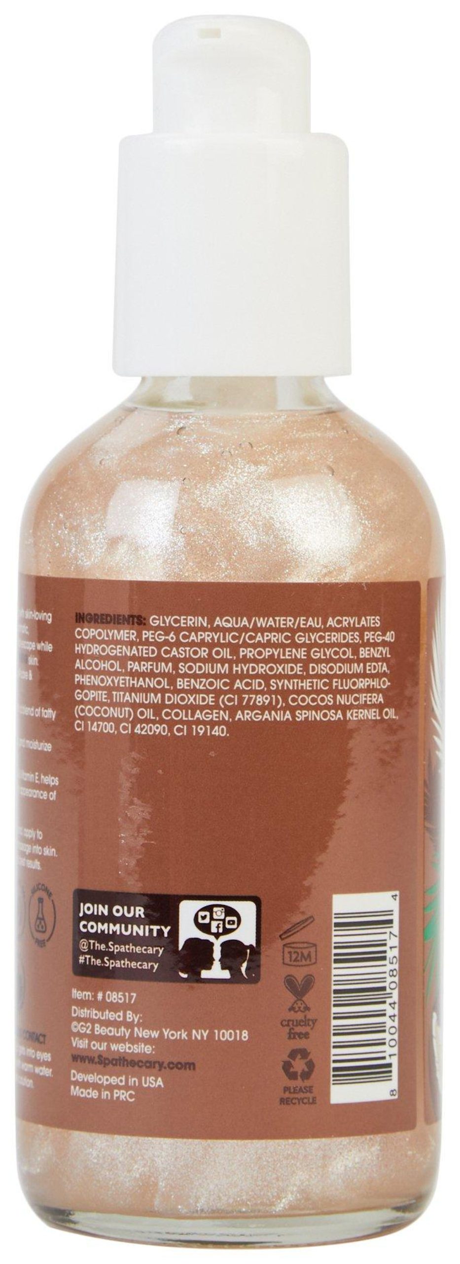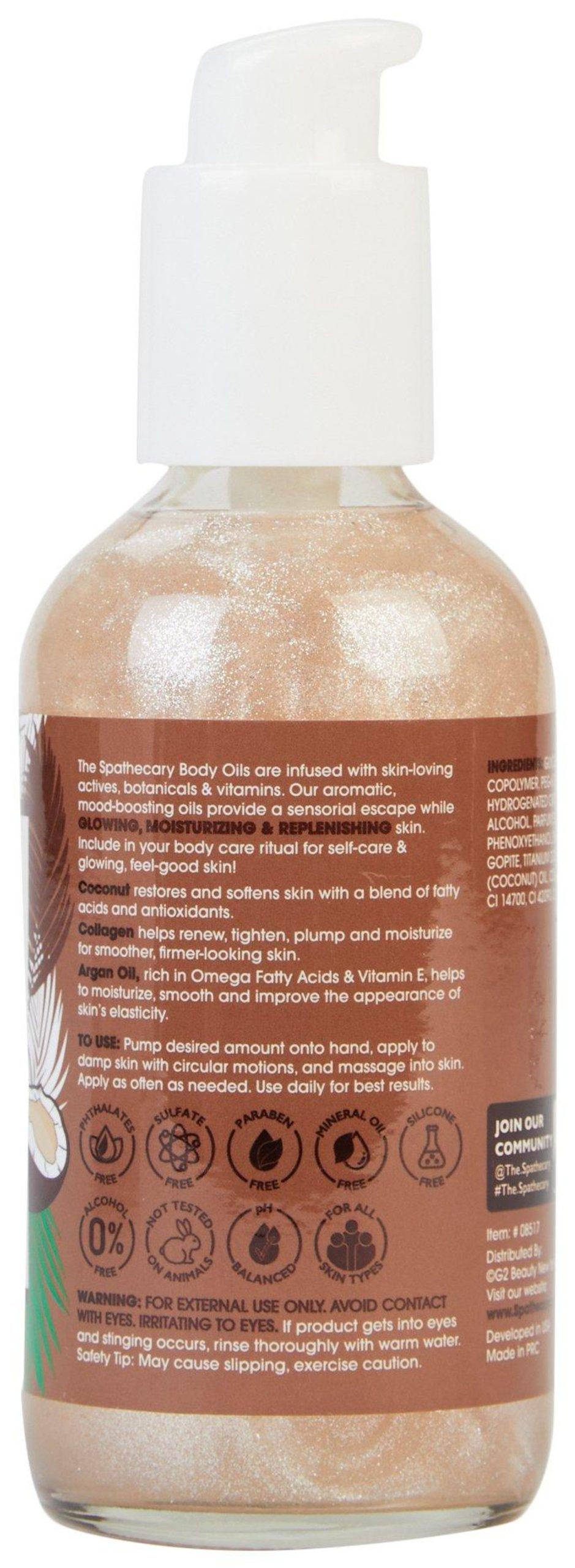 The Spathecary Body Oils are infused with skin-loving actives, botanicals & vitamins. Our aromatic, mood-boosting oils provide a sensorial escape while GLOWING, MOISTURIZING & REPLENISHING skin. Include in your body care ritual for self-care & glowing, feel-good skin! Pump desired amount onto hand, apply to damp skin with circular motions, and massage into skin. Apply as often as needed. Use daily for best results.