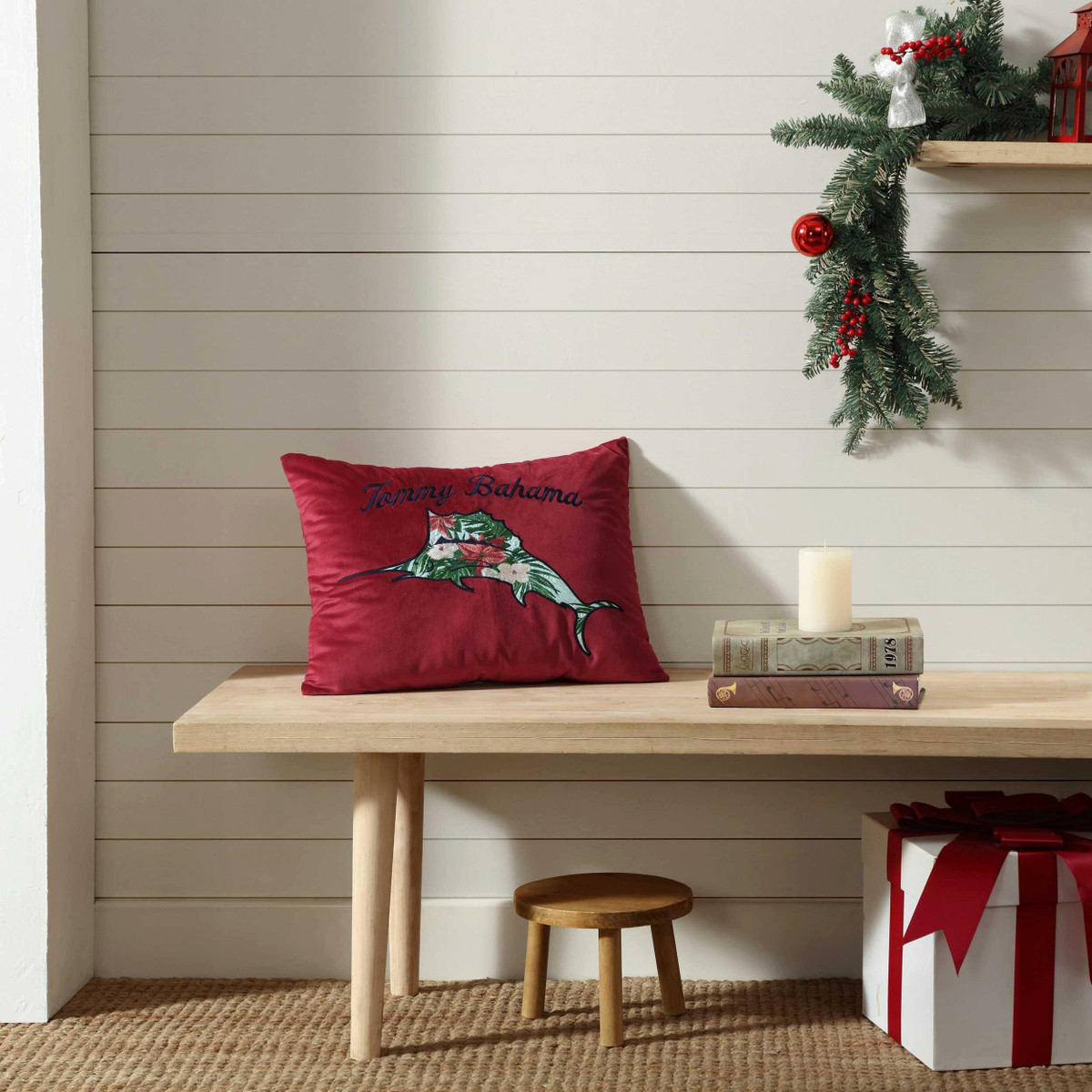 Our Tommy Bahama Holiday Marlin breakfast pillow infuses your space with a beach oasis vibe. Perfect for adding a coastal touch to your bed, couch, or chair, this pillow brings stylish charm to your shore house. Materia is 100% cotton, weight: medium weight. Machine washable for easy maintenance. Measures 15 in. x 20 in.