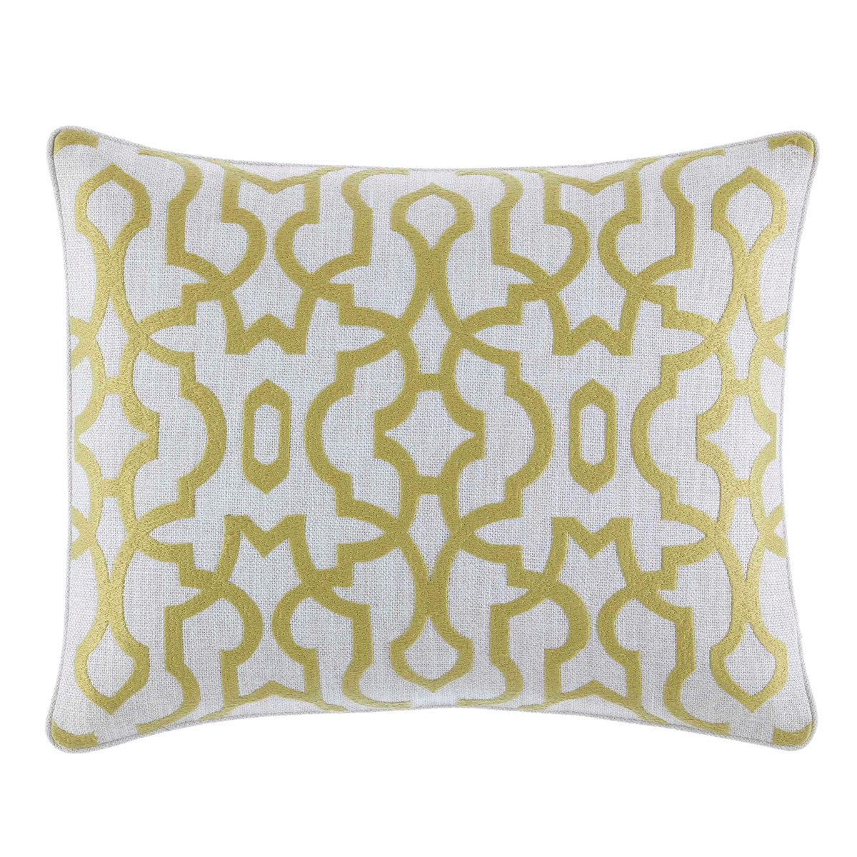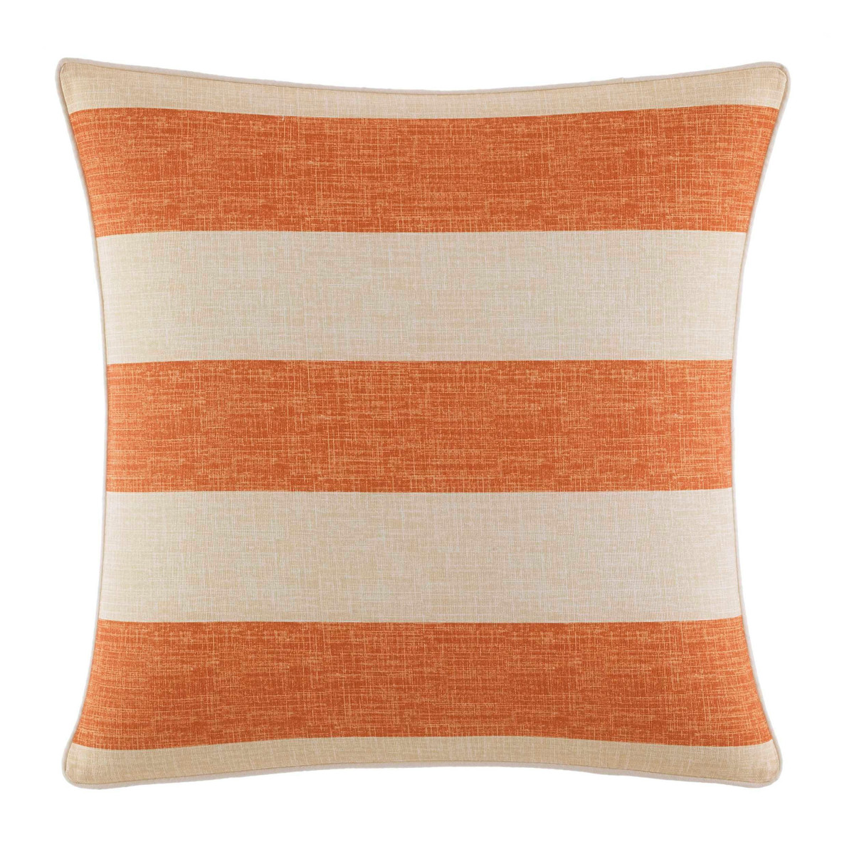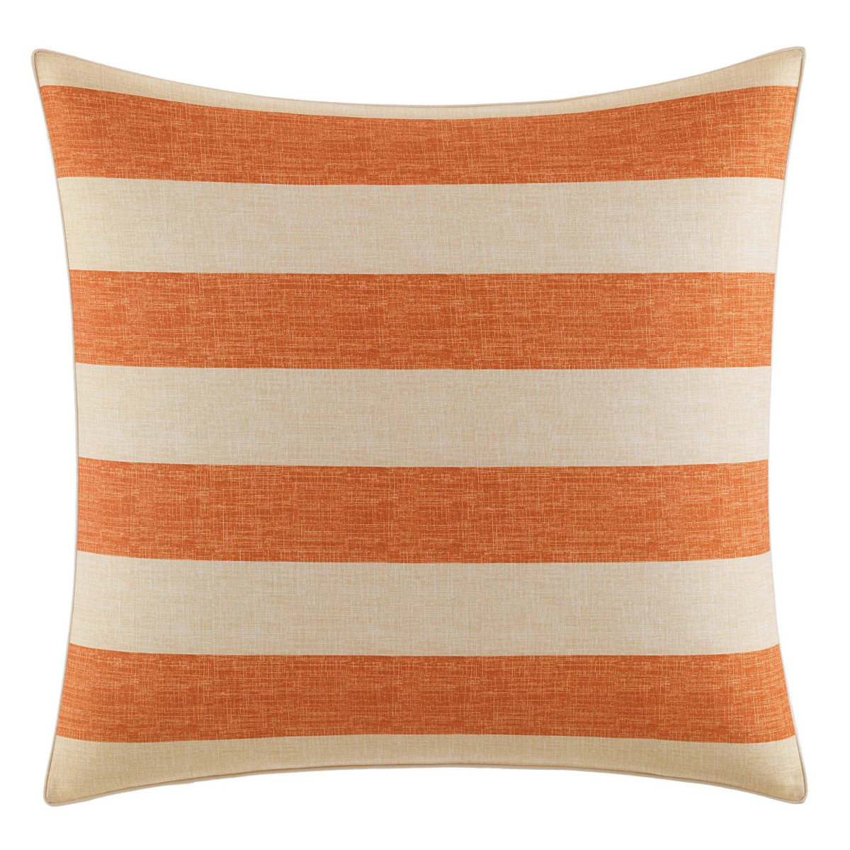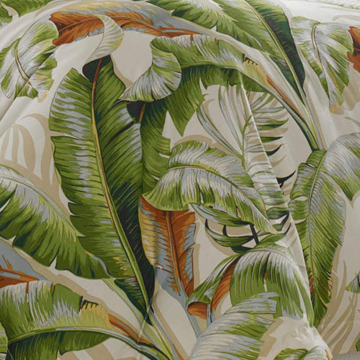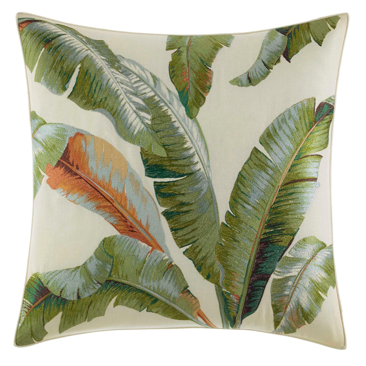 Dramatic tropical Foliage is printed on soft cotton sateen in deep greens and neutral tones on ivory with a coral accent note echoed by the casual Awning Stripe on the European shams and accent pillow. Two additional accent pillows feature intricate embroidery in complementary lattice and tropical leaf patterns. Coordinate with one of our stone washed cotton sheet sets and enjoy a comfortable and relaxing sleep.