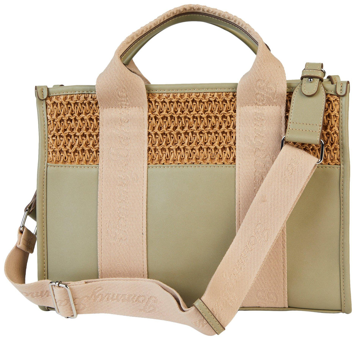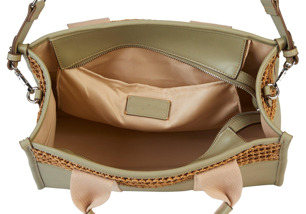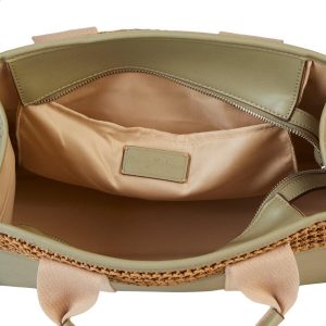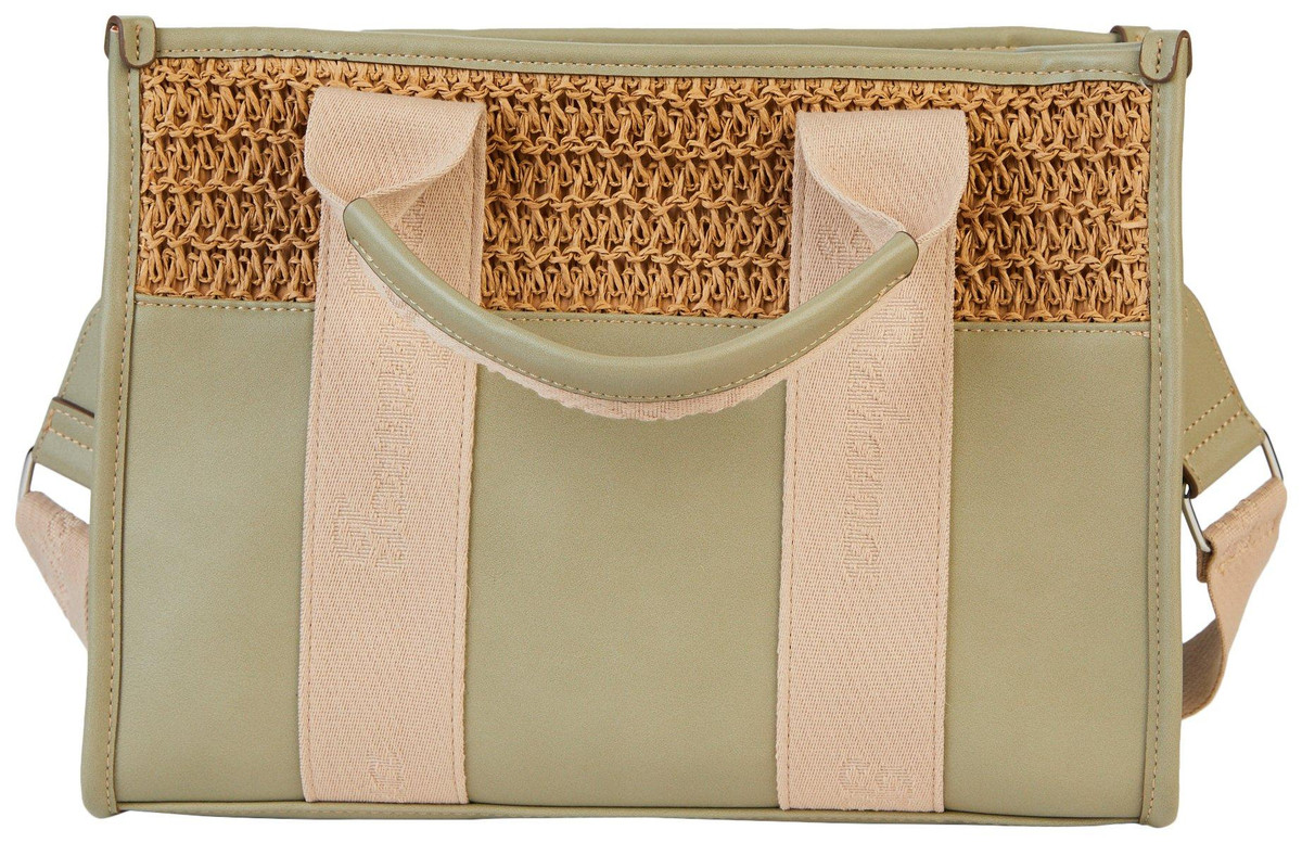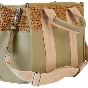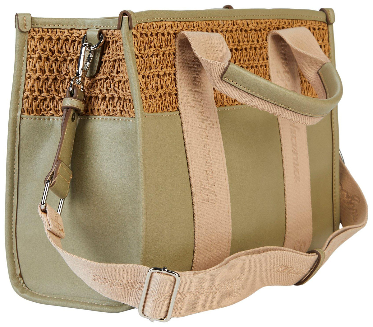 This tote combines the natural texture of raffia with sleek PU accents for a chic, tropical-inspired look. Featuring bold logo webbing straps and a spacious interior, this tote is perfect for carrying all your essentials, from workday must-haves to weekend getaway items. The secure zip-top closure and interior pockets ensure your belongings stay organized and safe, while the lightweight design makes it easy to carry. Measures approximately 13 in W x 9.5 in H x 5 in D.