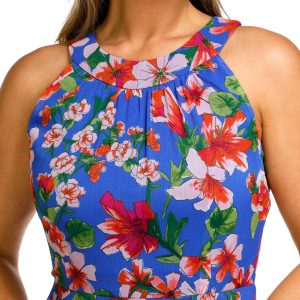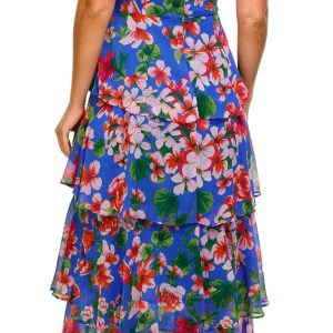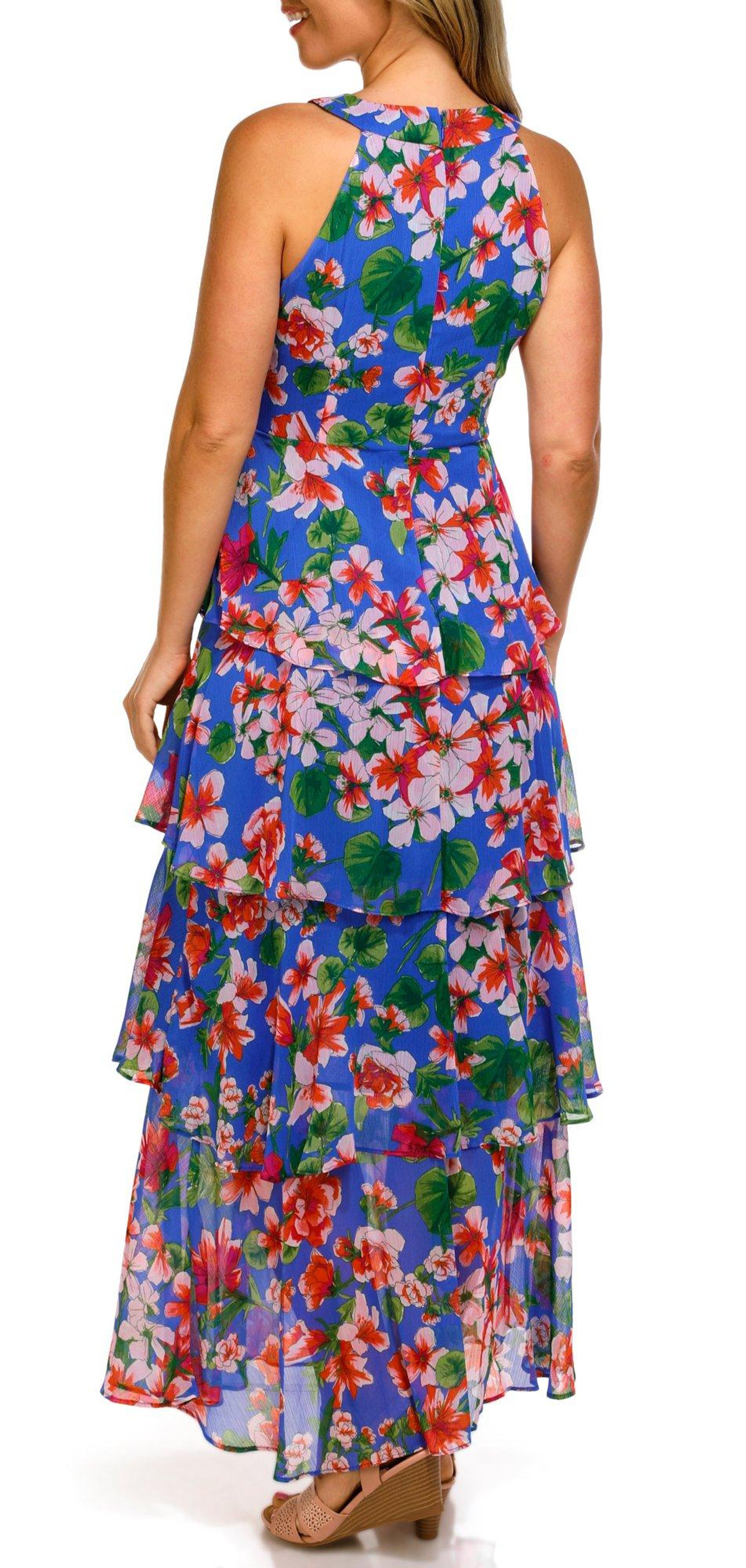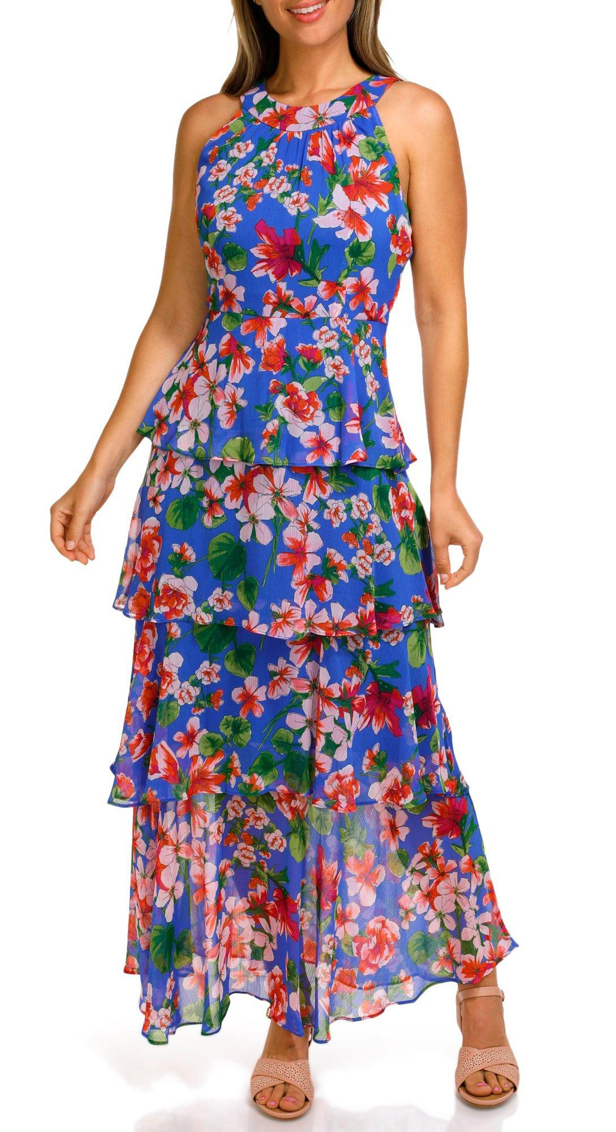 Effortlessly elegant, this Womens Sleeveless Halter Maxi Dress features a vibrant floral print, ruffle-tiered skirt, and flowing maxi length. Crafted from soft polyester, its designed with a flattering halter neckline and a convenient back zip for a perfect fitideal for warm-weather occasions or a breezy evening out.