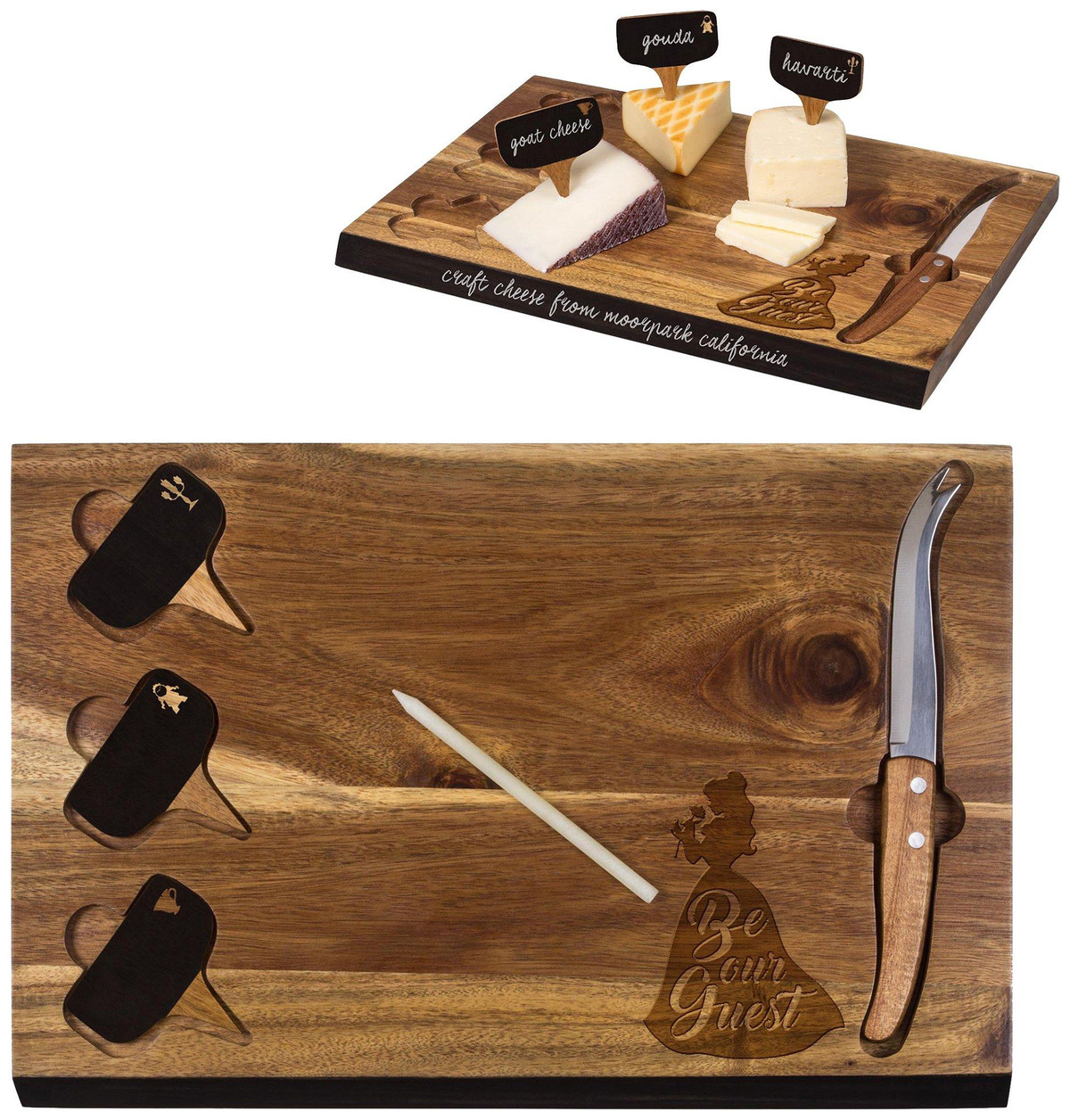 Cutting board and cheese tools set includes cutting board, one cheese knife, three cheese markers, and one soapstone pencil. Set features decoration of Beauty and the Beast and cutouts to fit knife & cheese markers. Measures: 15 ” x 10 x .8.