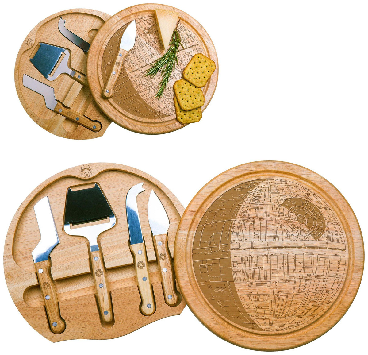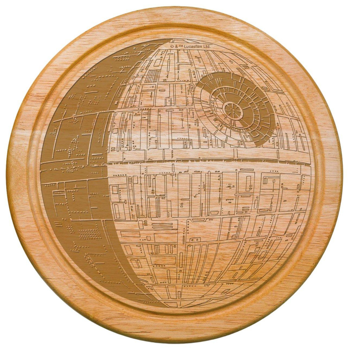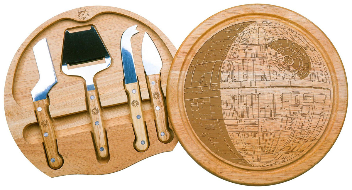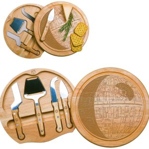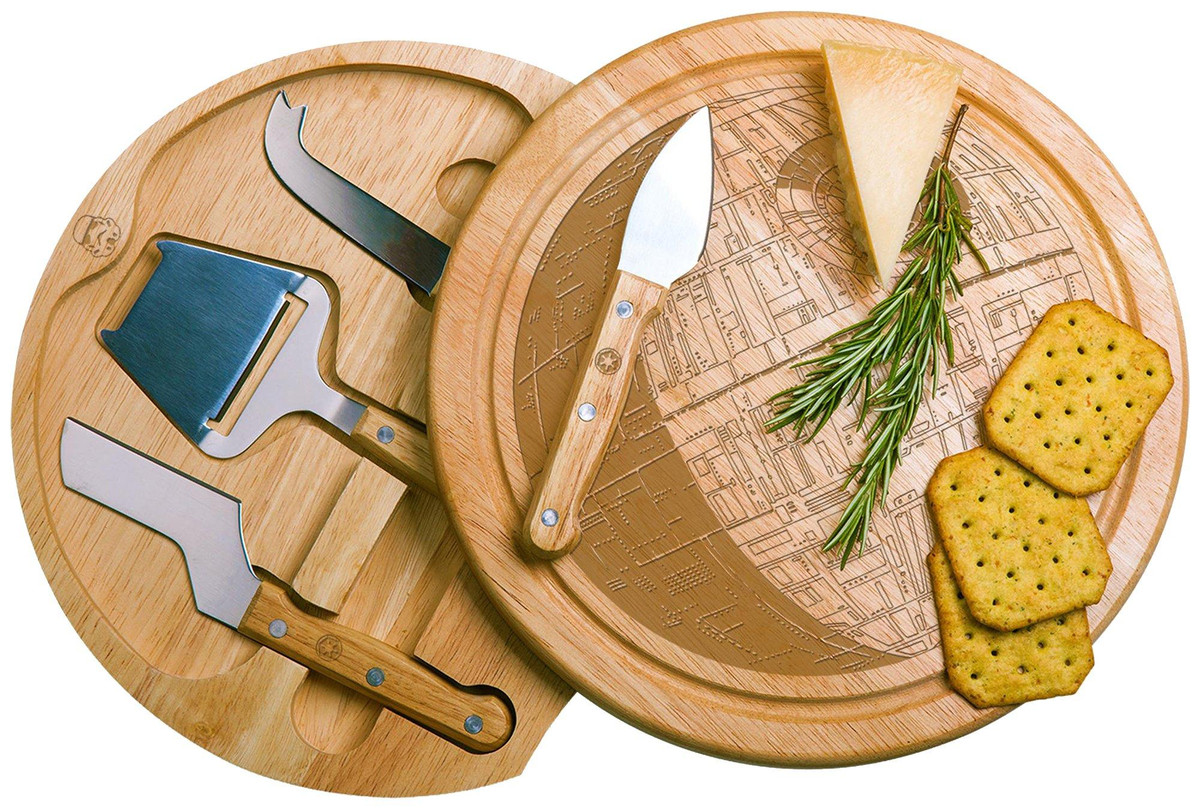 Circular cheese/cutting board comes with 4 full-tang stainless steel tools with wood handles (cheese cleaver, cheese planer, knife, and fork tipped knife). Made of rubberwood and measures 10.2 diameter x 1.6. Decoration features Star Wars Death Star design.