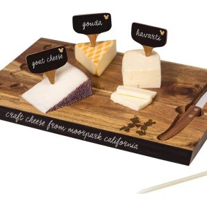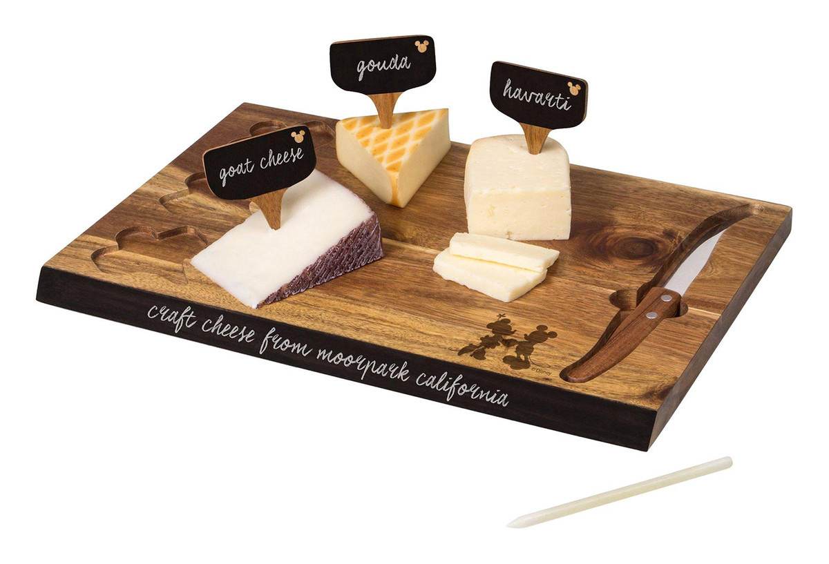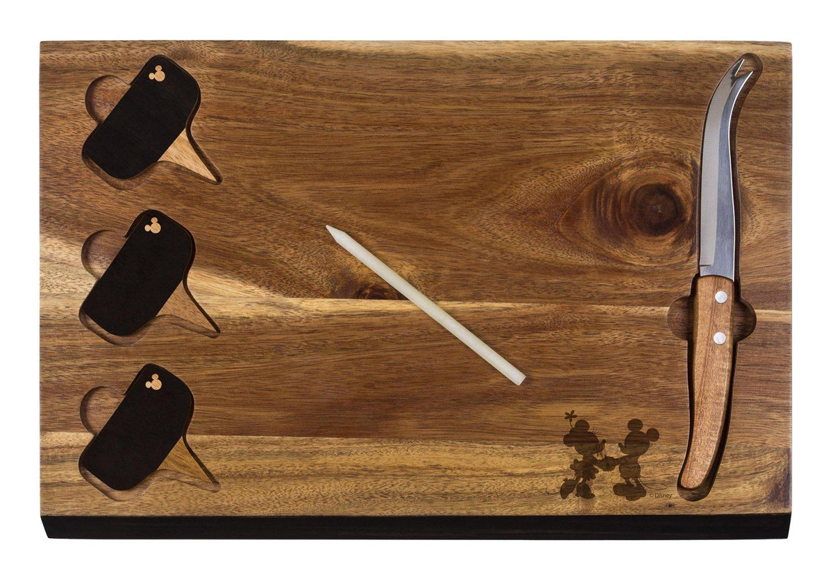 Cutting board and cheese tools set includes cutting board, one cheese knife, three cheese markers, and one soapstone pencil. Set features decoration of Disney Mickey & Minnie Mouse and cutouts to fit knife & cheese markers. Measures: 15 x 10 x .8 inches.