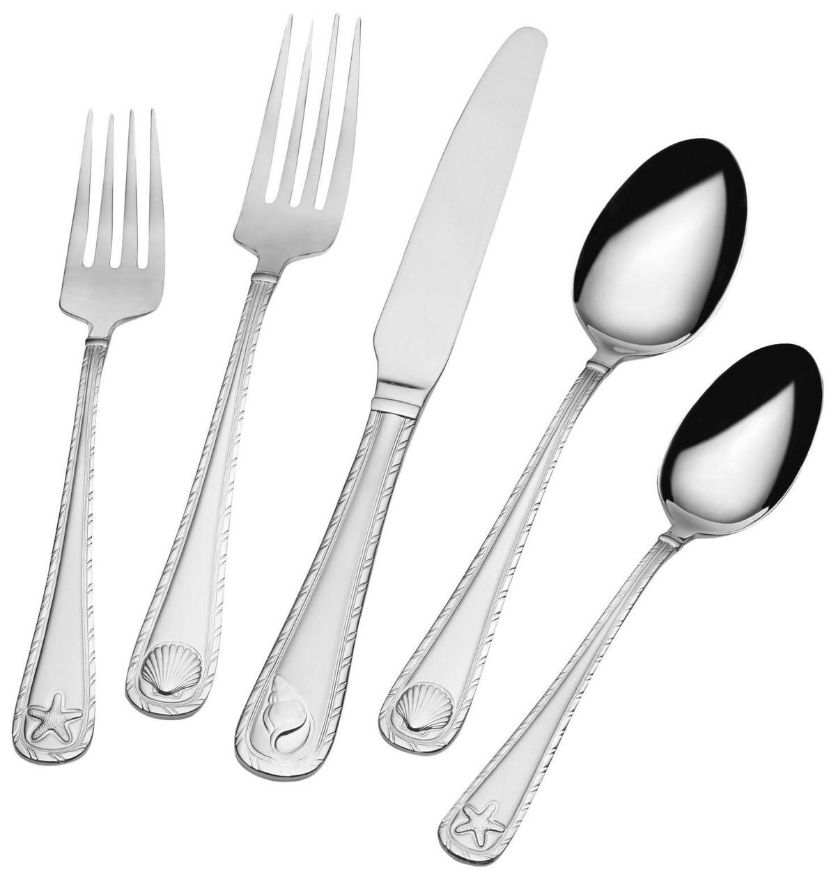 Whimsical & fun, the Towle Antigua flatware set features a nautical rope border & a tiny shell designs. Service for four includes 4 each: dinner fork, salad fork, dinner knife, dinner spoon & teaspoon. Crafted from superior 18/0 stainless steel.