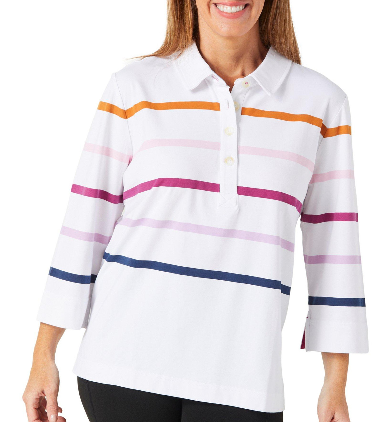 This womens three quarter sleeve stripe polo blends classic charm with modern comfort. Featuring a stylish striped print and a polo neckline it is perfect for casual days with its flattering three quarter length sleeves and easygoing fit.