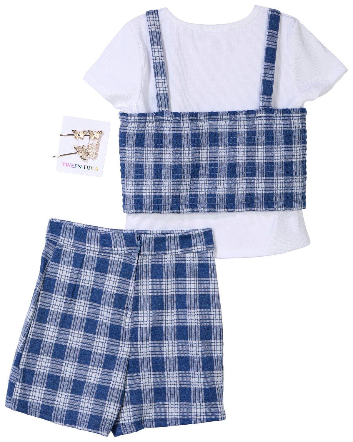 Delight her style with the Big Girls 2Pc Plaid Tee & Crossover Skort Set. Featuring a tee layered under a plaid vest and a matching crossover plaid skort, this set blends coordinated detailing and stretchy polyesterspandex fabric for flexible comfort. Ideal for school days, events or casual outings. Machine wash cold for easy care. Fabrication is 97% polyester, 3% spandex.