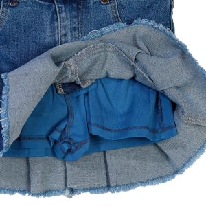 This two piece set for little girls includes a white crew neck tee with short pink sleeves and a cute teddy bear print. Paired with a denim skirt featuring built in biker style shorts for added comfort and coverage. Faux front pockets add a stylish touch to this playful and practical outfit.