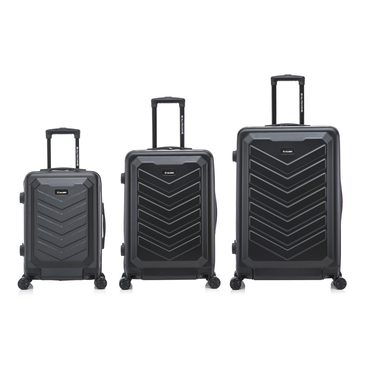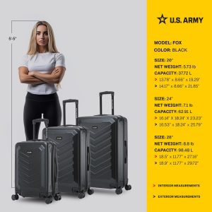 The U.S. ARMY FOX Collection 3-Piece Luggage Set is a tribute to the bravery and strength of the U.S. Army.Crafted for both durability and style in mind, this luggage set suitcases feature a lightweight hard-flex shell, enduring most rigors of travel, glides on four double multi-directional spinner wheels for effortless mobility, and is fully lined. Measures (20 in) 14.17 x 8.66 x 21.85, (24 in)16.53 x 10.24 x 25.79,(28 in) 18.9 x 11.77 x 29.72.