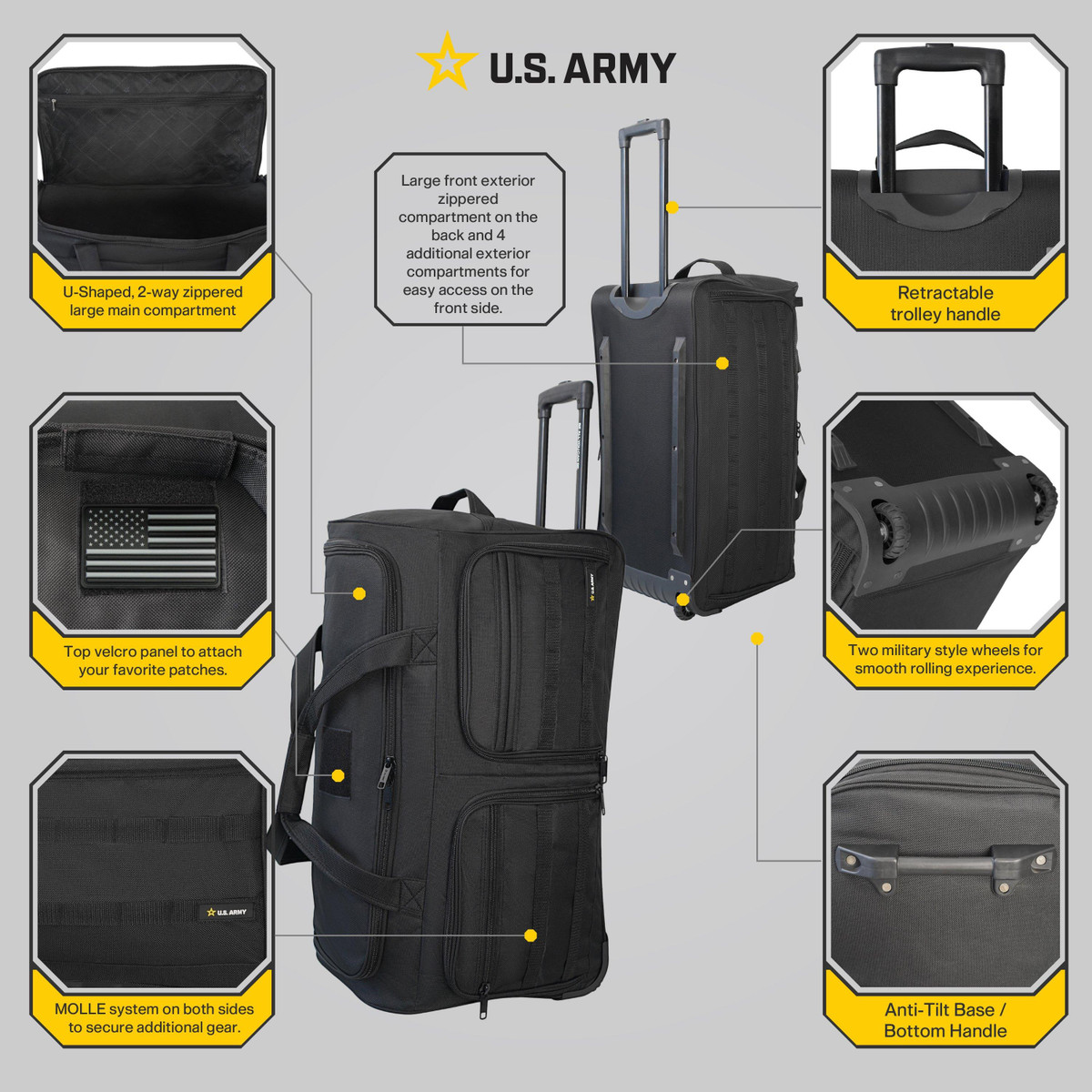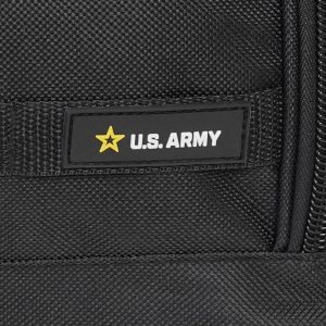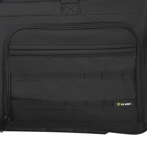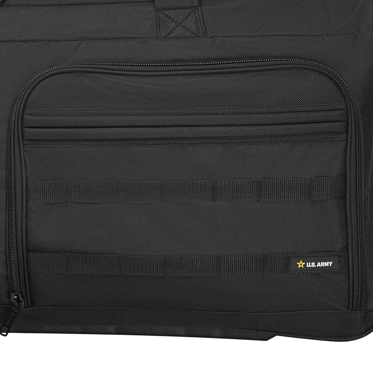 The U.S. Army ROMEO 28 in. Wheeled Duffel Bag is constructed from durable 900D polyester. This lightweight heavy-duty, water-resistant bag is features multiple compartments, a large U-shaped main compartment with internal zippered pocket, four exterior compartments on one side and a large exterior compartment on the other. The MOLLE webbing system allows secure attachment of extra gear, and retractable trolley handle and military-style wheels ensure mobility. Measures 14.96 x 14.37 x 28.