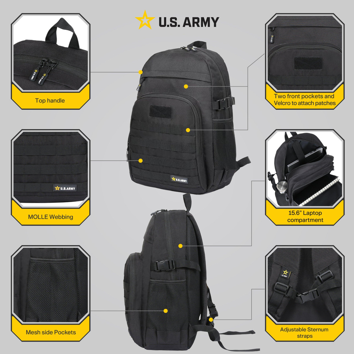 The U.S. Army TANGO Tactical Backpack has a lightweight, water-resistant has a 22-liter capacity, and features a well-organized multi-compartment layout to keep your essentials in order. It features MOLLE webbing and Velcro panel for patches on the front for added gear attachment, side compression straps, and a fully padded sleeve that fits laptops up to 15.6. Includes padded shoulder straps, a cushioned back panel, and adjustable sternum straps. Measures 18.1 x 11.8 x 5.1.