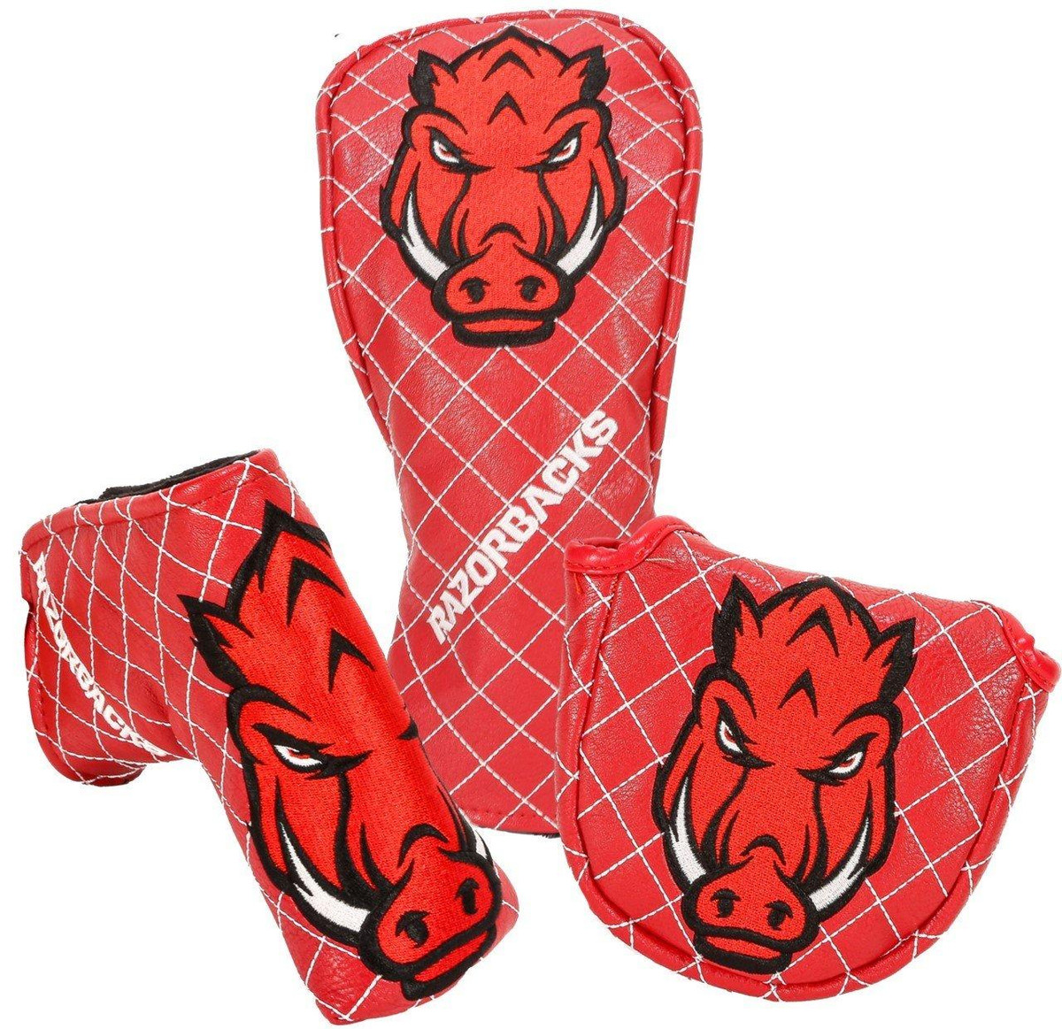 Rep your team with a custom University Of Arkansas Razorbacks Headcover from our highly sought-after NCAA Golf Collection. Our Golf Headcovers are uniquely designed in-house from CMC Designs. Add a touch of personality and enhance your golf game in style. Our headcovers are meticulously crafted using top-quality faux leather with a plush inner lining to protect your investment.
