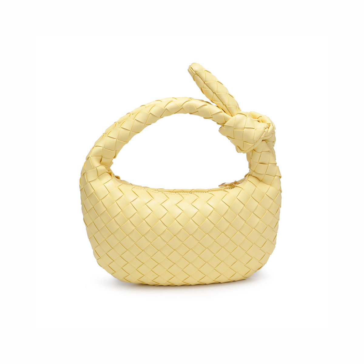 Introducing your new fave clutch, made from chic vegan leather. With a stylish zipper closure and an intricate woven design, this clutch boasts a unique knot handle detail and elegant gold hardware. Inside, the fabric lining keeps your essentials in check with a handy zip pocket. Perfect for adding a trendy touch to any outfit! Handbag measures 11.375 L x 2.125 W x 5.75 H.