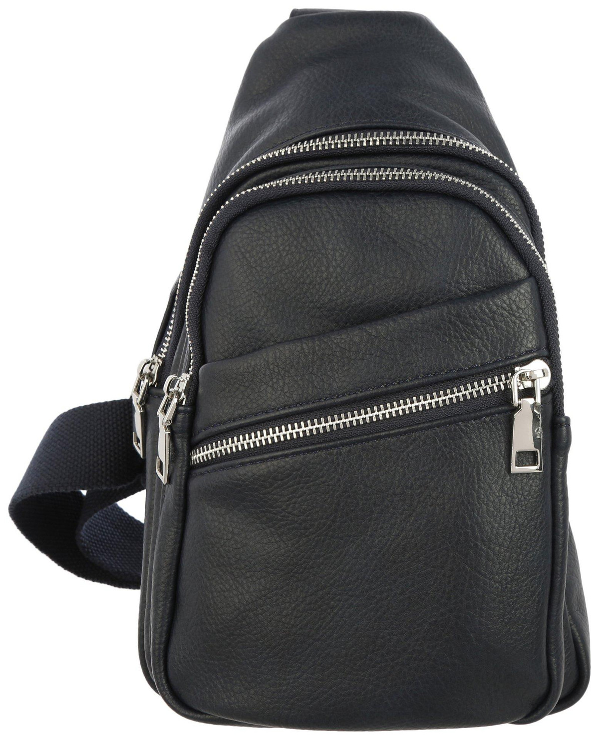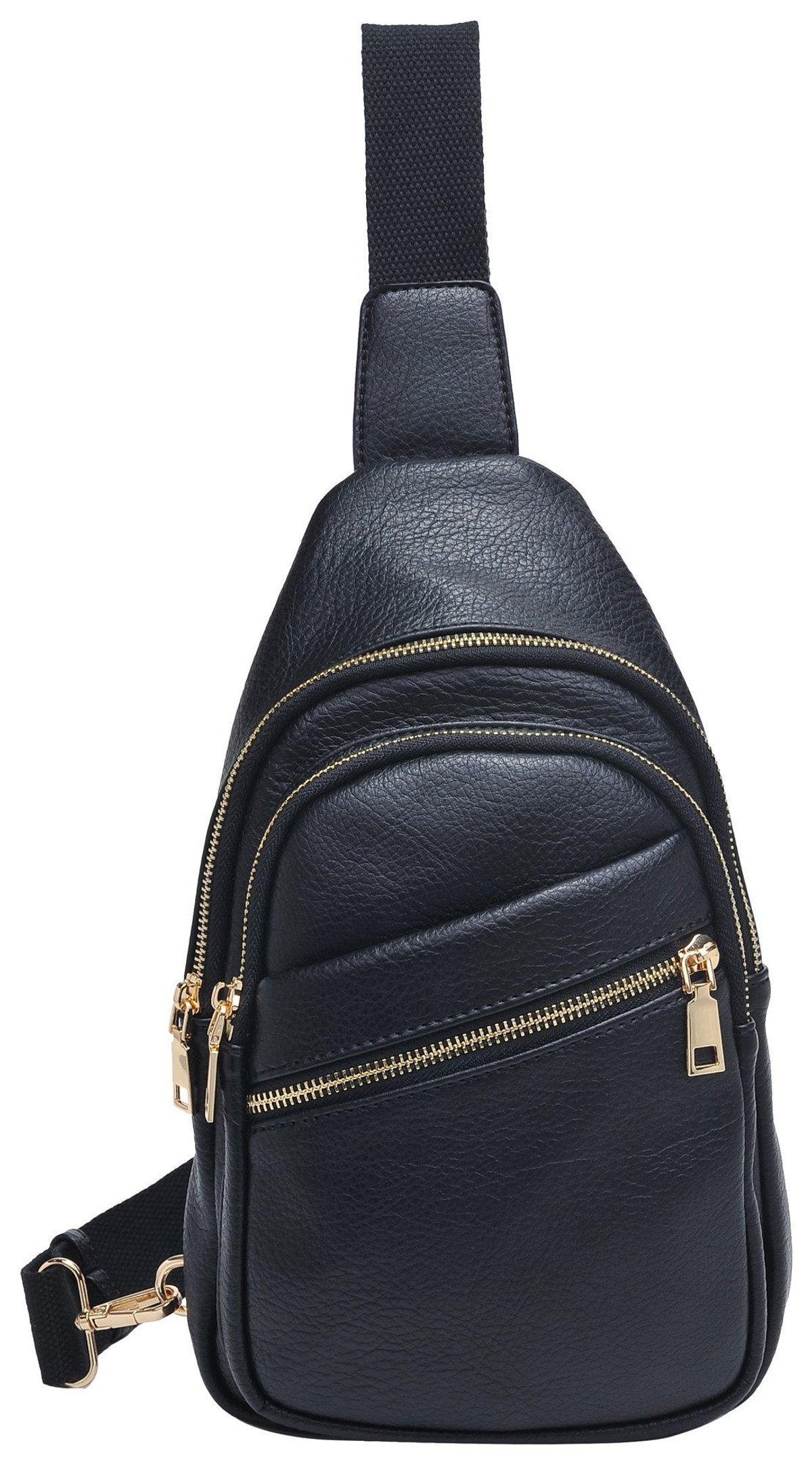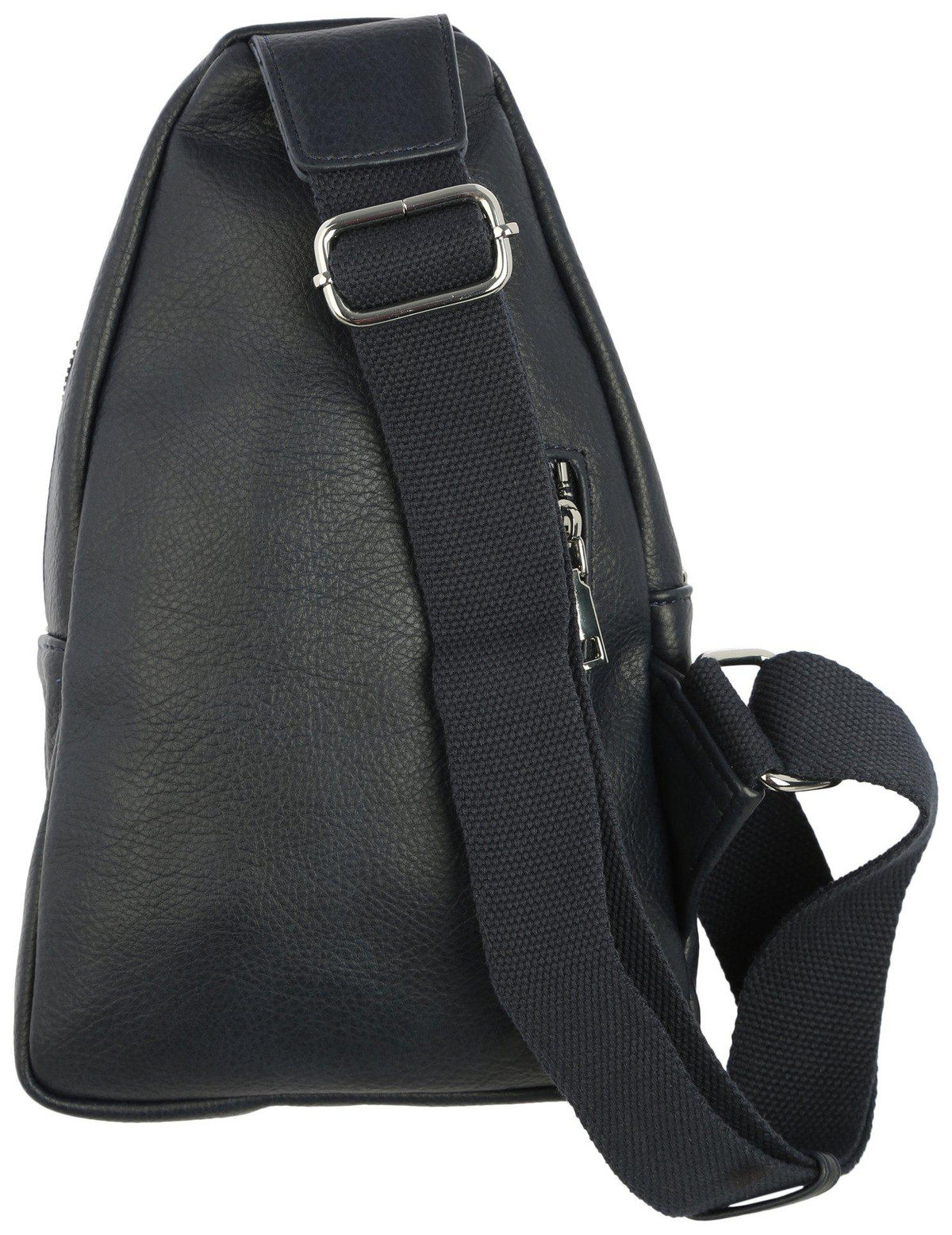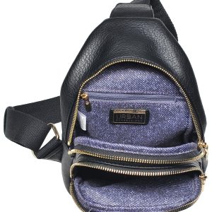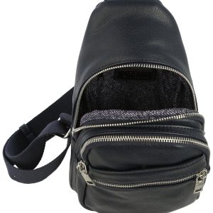 This Zephyr Sling Bag features a solid color design on a denim fabrication, a woven adjustable strap, a rear vertical zip pocket, one each slip and zipper pocket on a front pouch zip pocket, and a zip-around top closure. The lined interior contains 1 zipper pocket. Measures approximately 7 in. L x 2.5 in. W x 11.5 in. H. Strap measures approximately 22-39 inches.