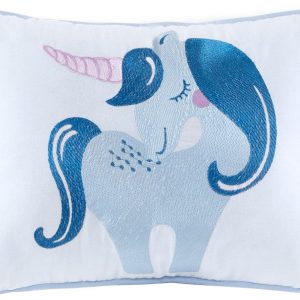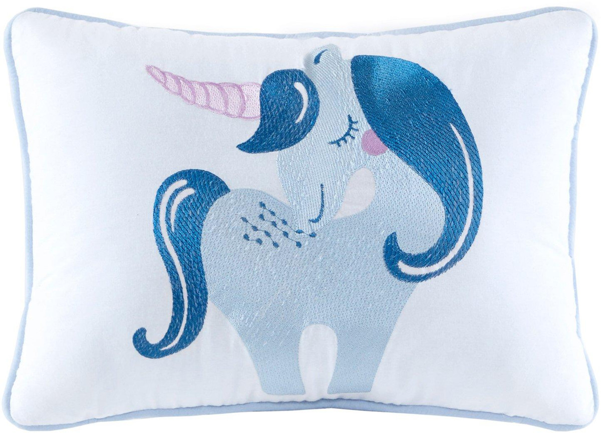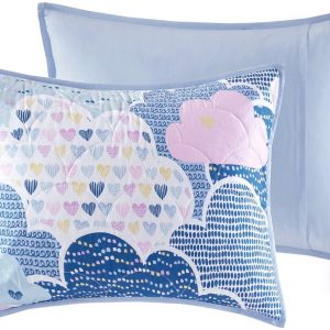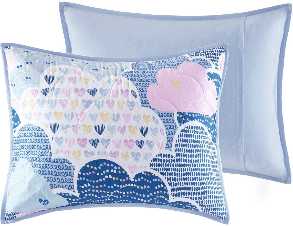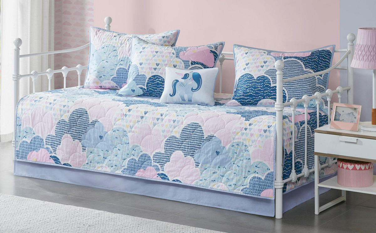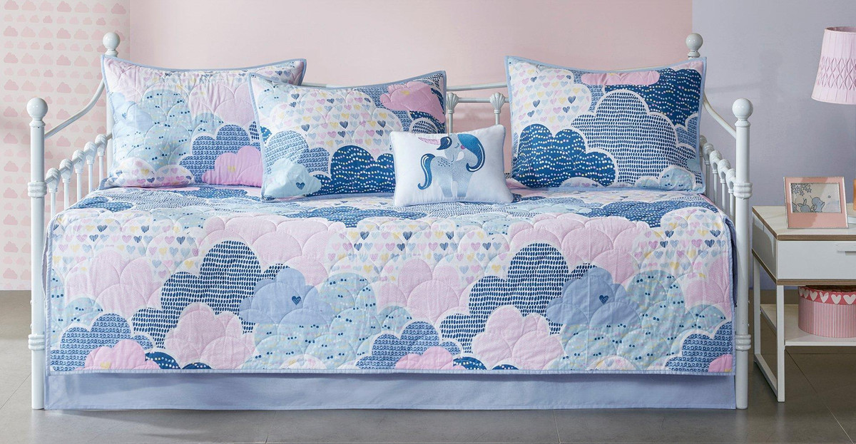 Drift off to dreamland with the whimsical charm of the Urban Habitat Kids Cloud 6 Piece Cotton Reversible Daybed Set. Made from 100% cotton, the quilted daybed cover features a printed cloud motif in a beautiful color palette of blue, purple, pink, and white with a coordinating solid blue reverse. Set includes daybed cover, three shames, embroidered pillow, and solid blue bed skirt. Pillow measures: 12 x 16.