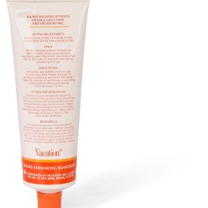 Vacation Orange Gelee SPF 30 is a luxurious balm-to-oil sunscreen that melts into skin for a silky feel and radiant glow. Water resistant for up to 80 minutes, it offers broad spectrum protection with a nostalgic scent inspired by the French Riviera. The orange tint rubs in clear, leaving skin hydrated and luminous