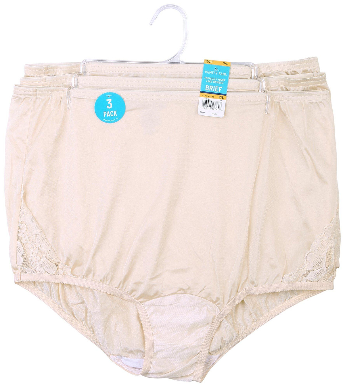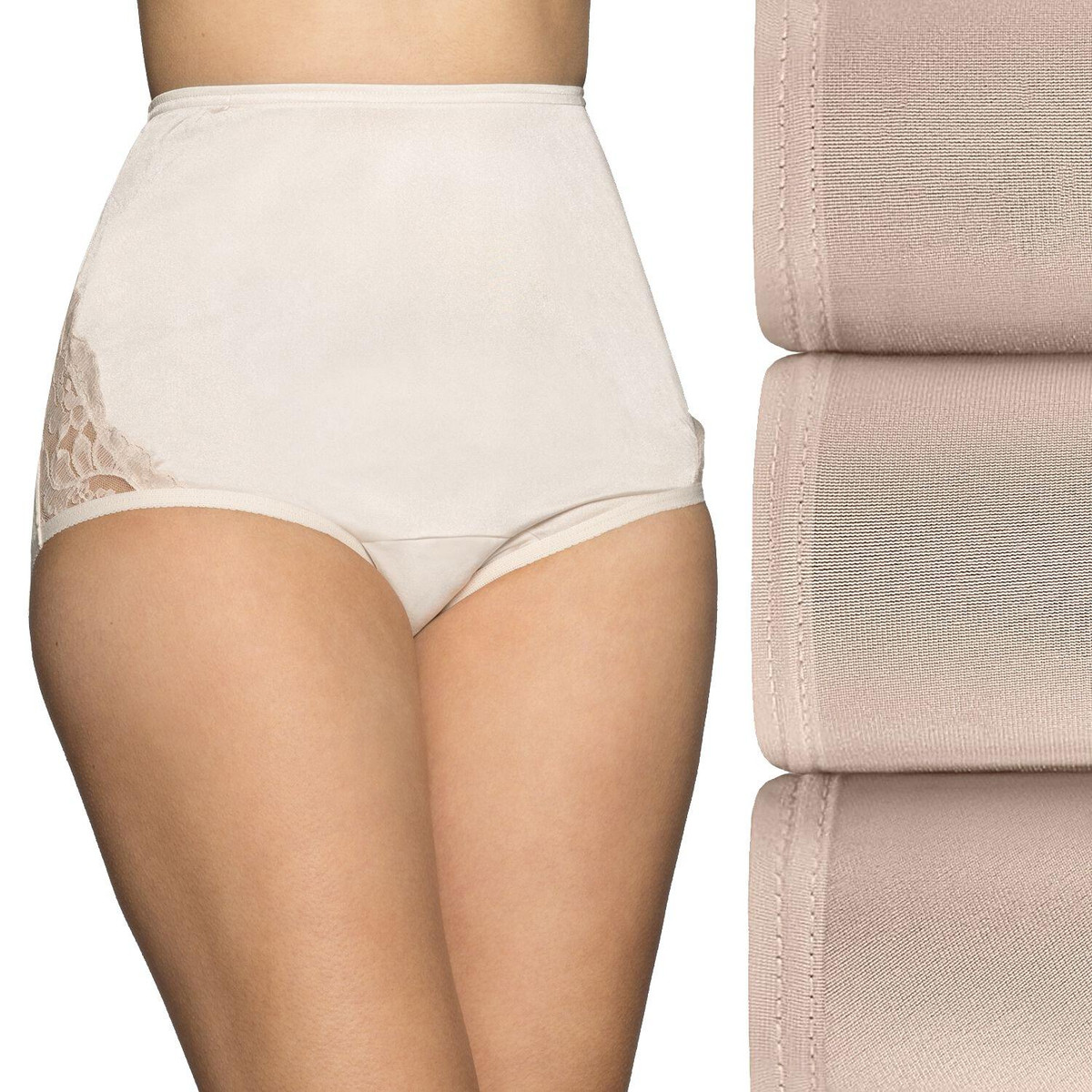 This Lace Nouveau Brief 3-Pack features a lightweight, semi-sheer solid color fabric for a barely-there look and feel with beautiful lace insets on the sides. This panty provides generous full rear and tummy coverage, the satin finish glides under clothes, a smooth covered elastic waistband allows for ultimate comfort, and feminine picot-edge leg elastic stays in place. Contains 3 briefs panties. Style 13011.