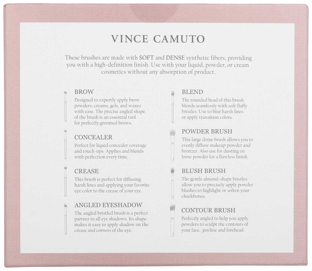 Streamline your beauty essentials with the 8 Pc Makeup Brush Set and Cosmetic Bag. Featuring synthetic brush heads and wood handles, the set includes Brow, Concealer, Crease, Angled Eyeshadow, Blend, Powder, Blush, and Contour brushes. Comes with a gold quilted cosmetic bag for stylish storage. Ideal for home or travel use. Wash brushes gently with mild soap and water, lay flat to air dry.