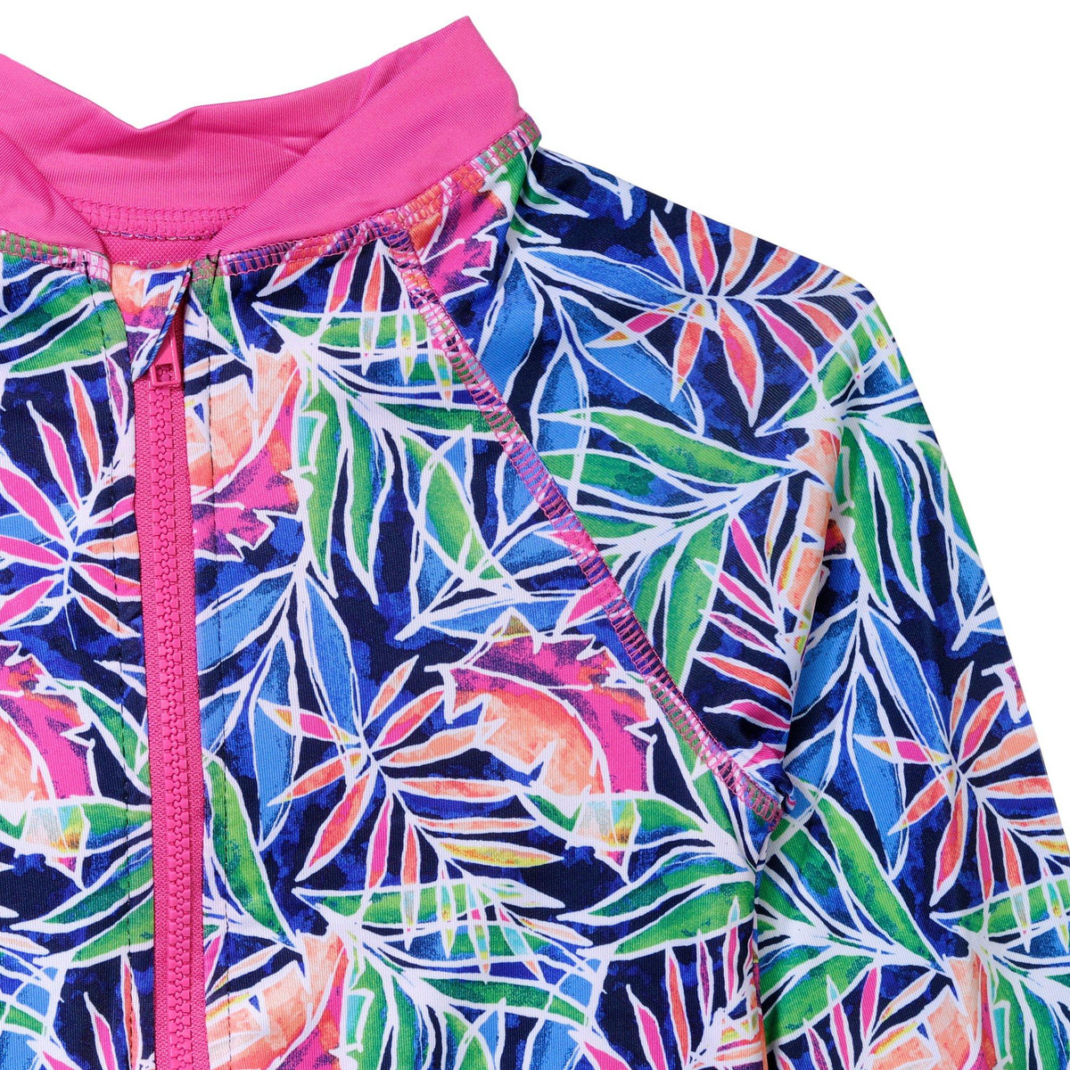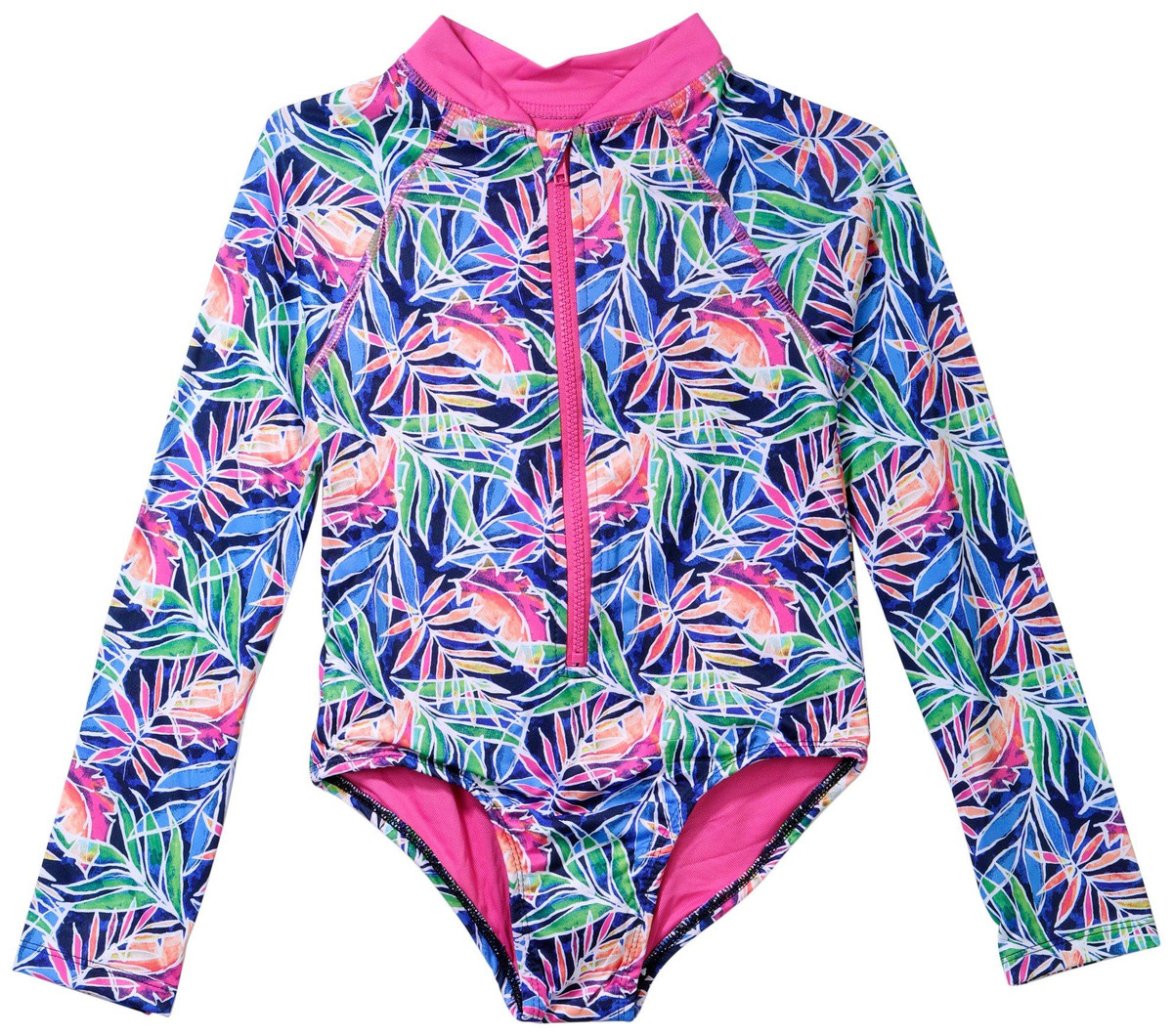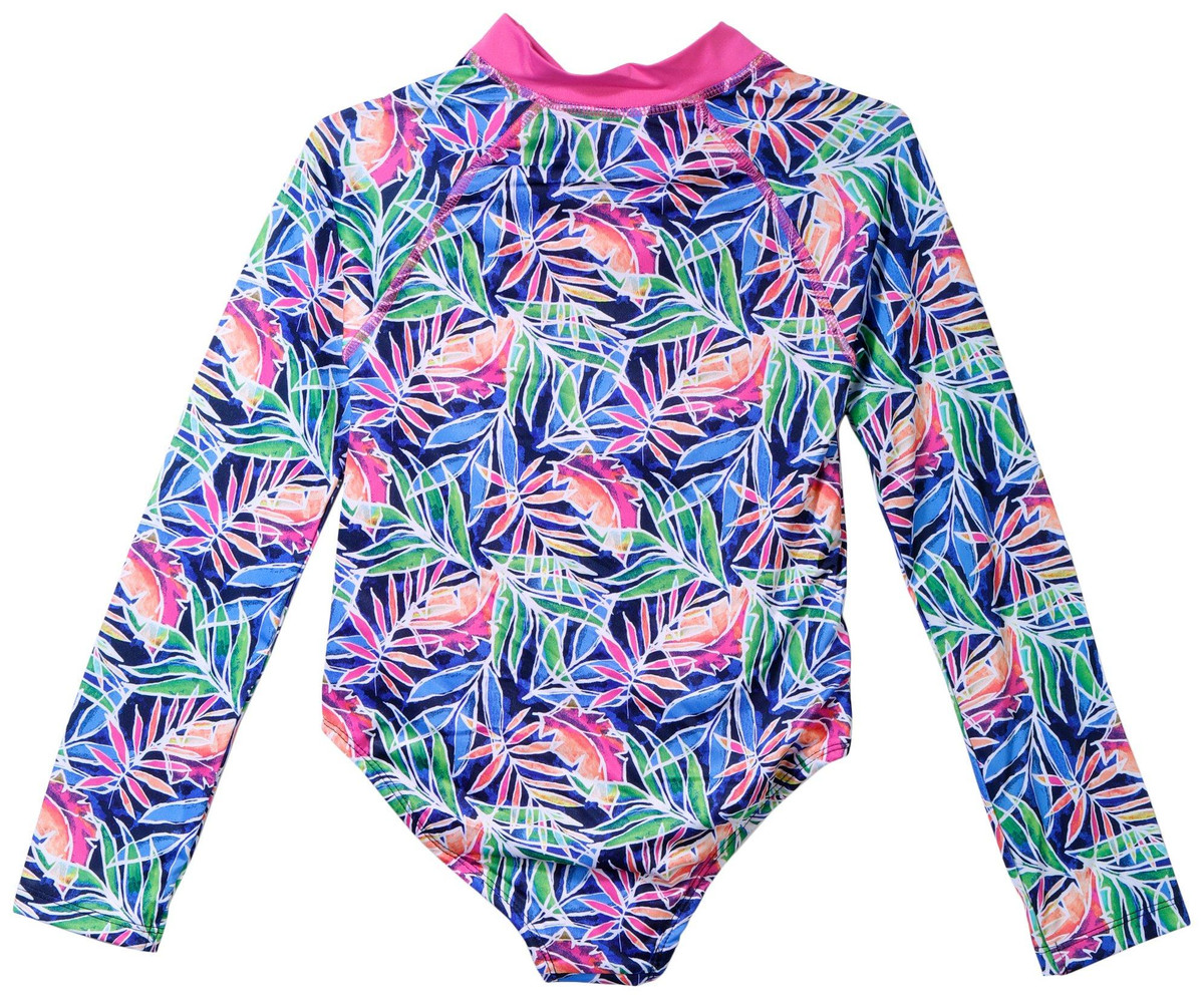 Let her make a splash in style with this Vince Camuto Girls long sleeve swimsuit. Featuring a vibrant tropical palm leaf print, this suit brings island vibes to every swim. The pink neckline and zipper add a bold pop of color while UPF 50 protection keeps her safe under the sun. Designed for comfort and movement, this rash guard is perfect for beach days and poolside fun, combining fashion and function for the ultimate swimwear essential.