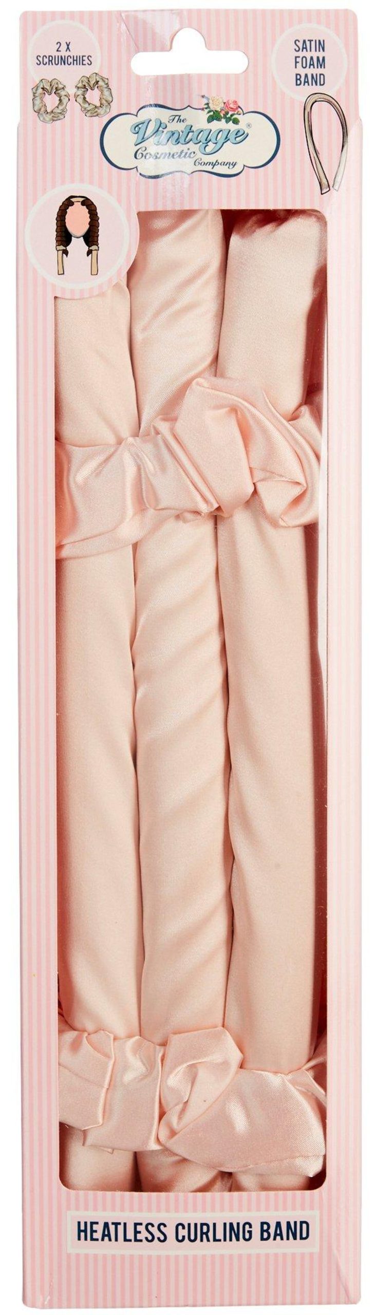 This Vintage Cosmetic Company 3-Pc. Heatless Curling Band Set features a satin-covered foam band and 2 satin scrunchies to help you achieve beautiful curls and waves without heat or chemical damage. Wrap damp hair and let dry naturally. Fabric is 100% polyester. Band measures approximately 40 in. L x 1 in. W.