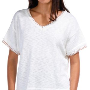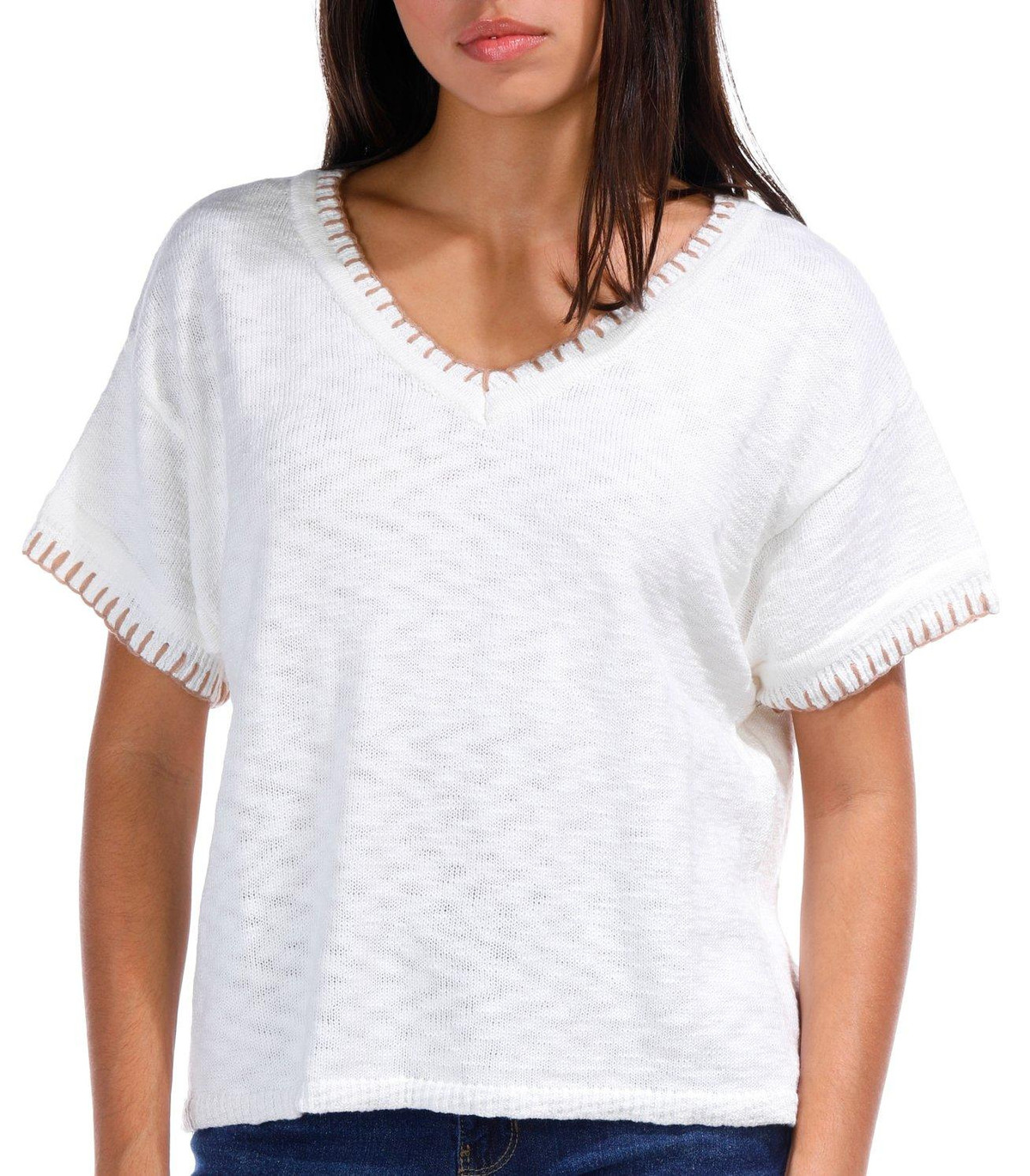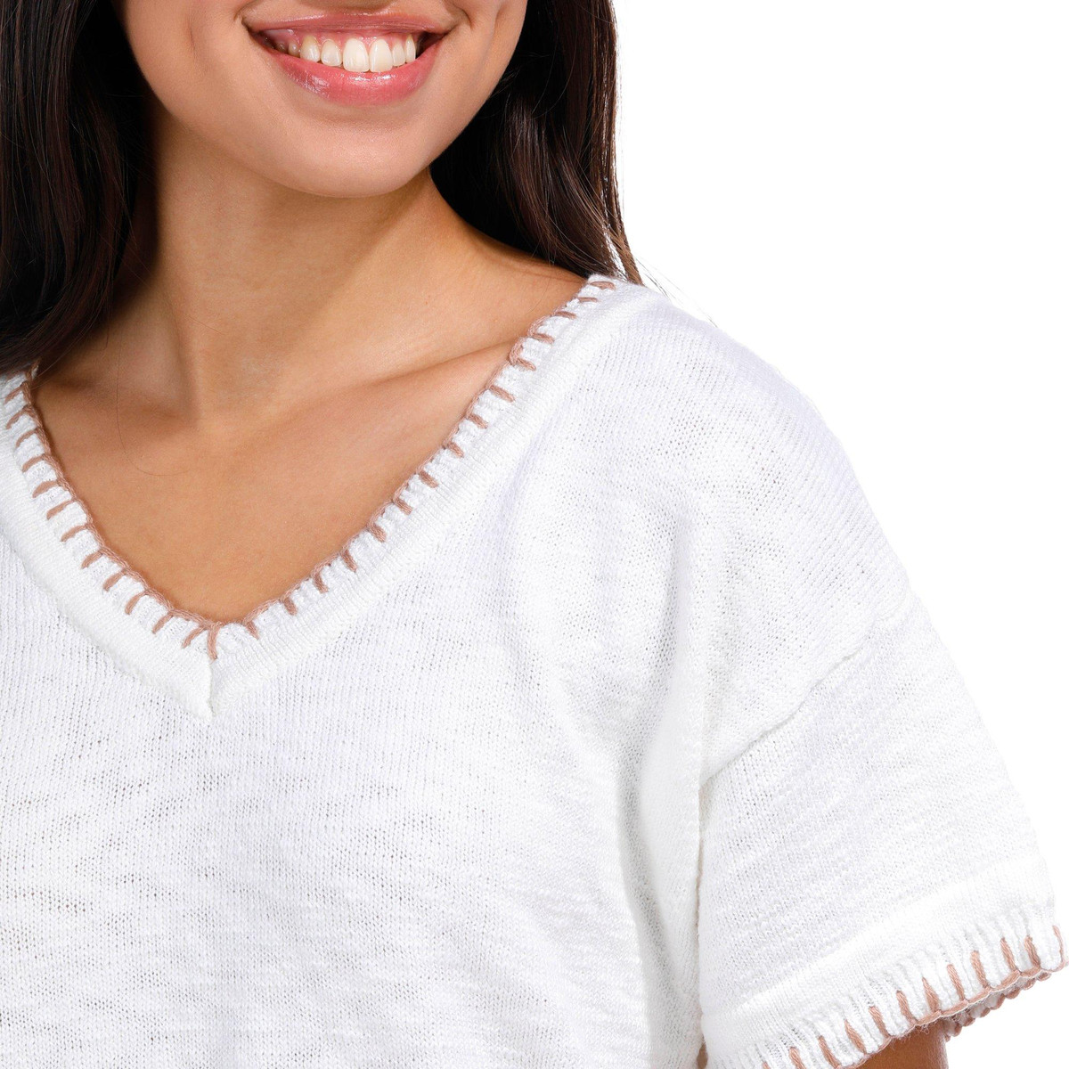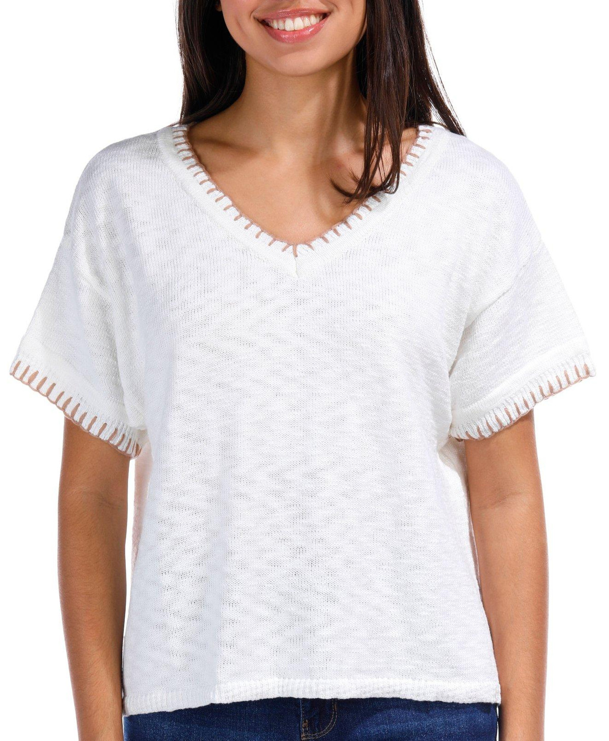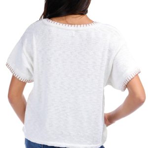 Enhance your wardrobe with our Juniors Short Sleeve Cropped Knit Sweater, featuring a stylish solid color, short sleeves and a rustic yarn trim on the neck and sleeves, while the cropped fit provides a modern twist. Perfect for layering over your favorite outfits, this sweater is a versatile and chic addition to your collection. Fabrication is 100% Acrylic. Top length measures approximately 22 in.n