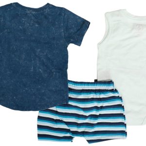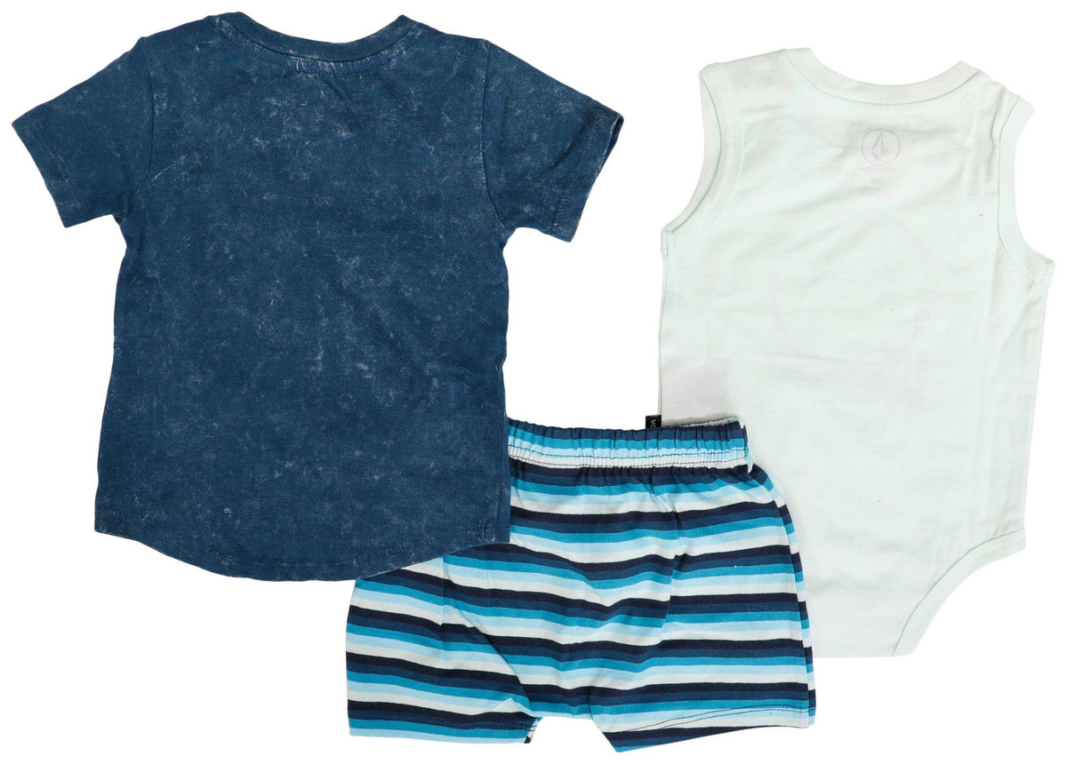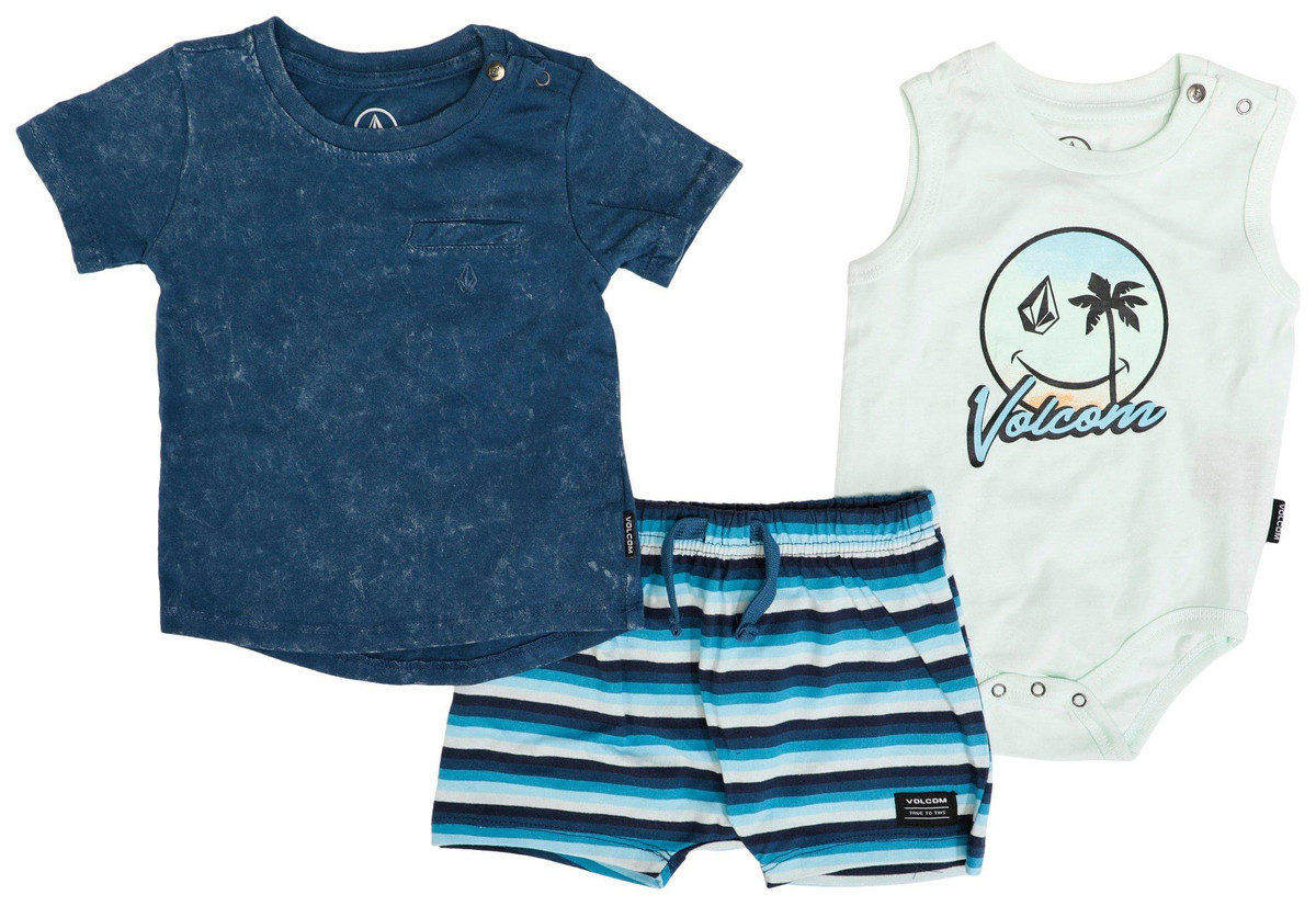 This Volcom Baby Boys three piece set is designed for style, comfort, and convenienceperfect for trendy moms who love effortless dressing. The soft, breathable onesie features a beach themed smiley face with easy button closures between the legs and on the shoulder for quick changes. The washed blue crew neck t shirt includes side shoulder buttons for hassle free wear. Paired with striped shorts in calming blue hues and white, this set is a must have for fashionable little adventurers.