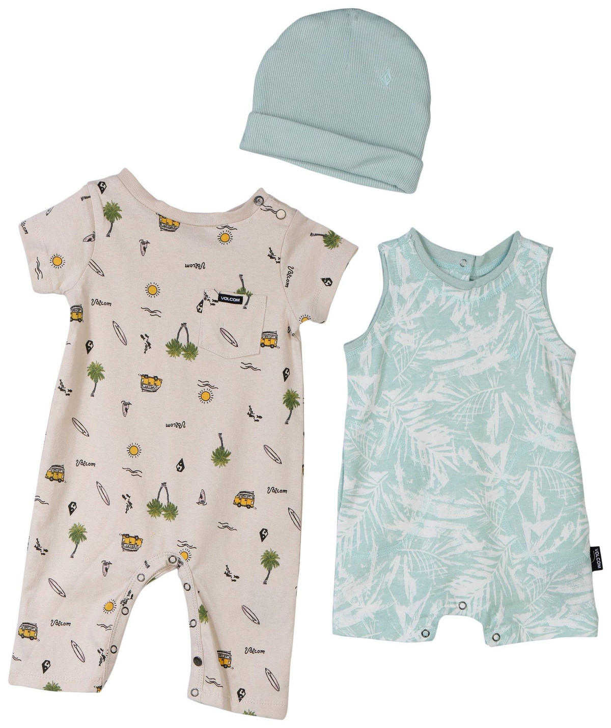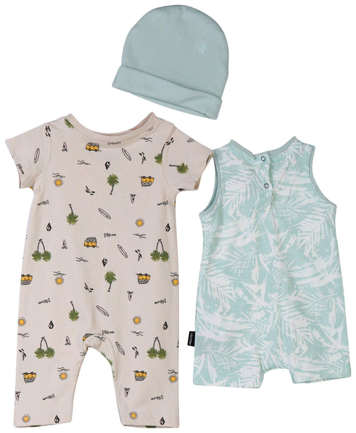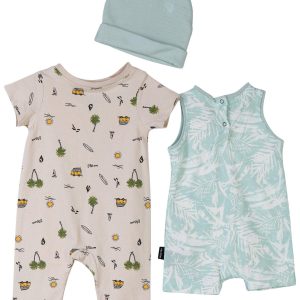 Keep little ones comfortable with the Baby Boys 3 Pc Palm Tree Rompers and Hat Set, featuring a short sleeve long pant romper, a tank short pants romper, and a coordinating hat. Crafted for softness and ease of movement. Ideal for daily wear, playtime, and warm-weather outings. Fabrication is 100% cotton.