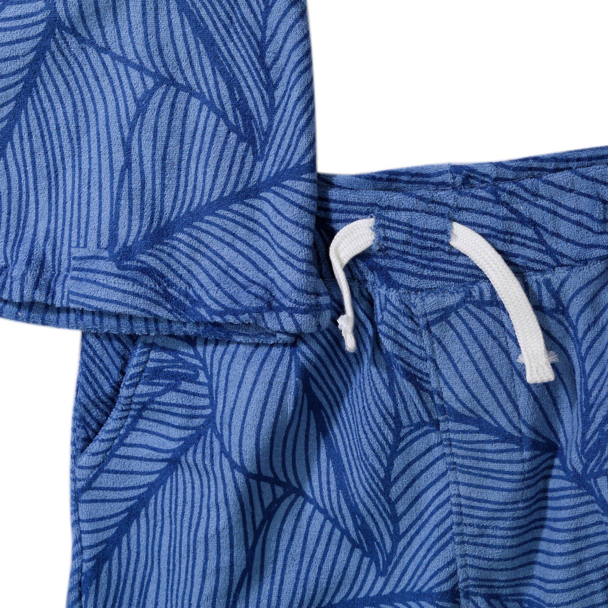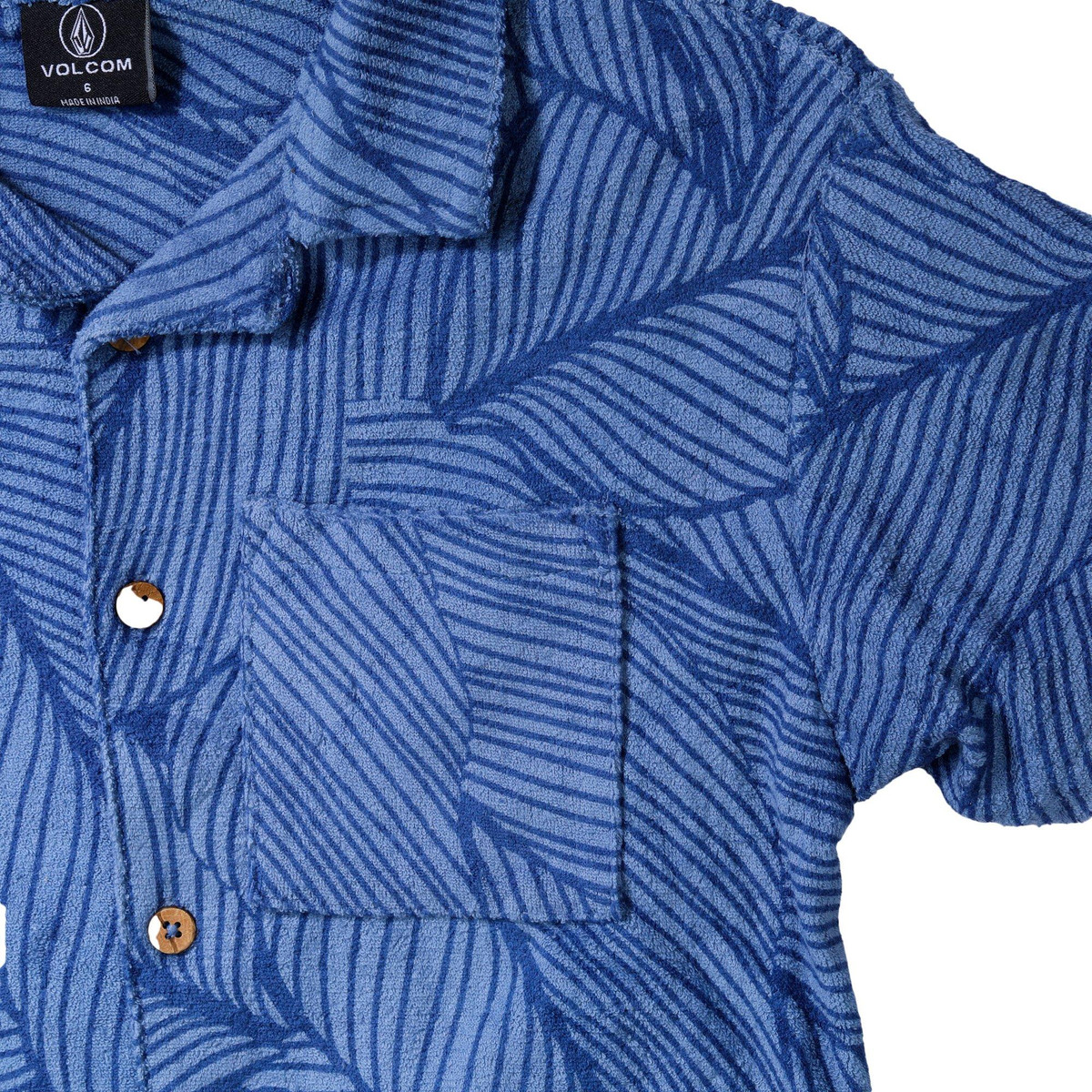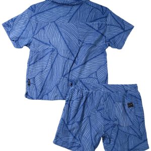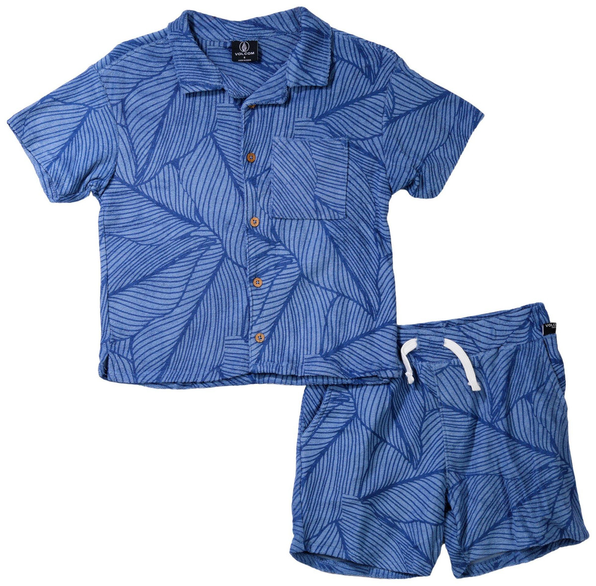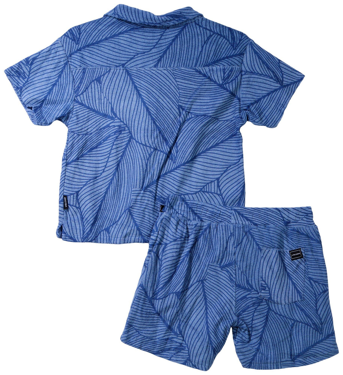The Volcom Boys 2-Piece Set delivers effortless style and comfort for any occasion. The blue tropical-print short sleeve button-down shirt features a classic collared neckline, paired with matching shorts for a relaxed, beach-ready look. Made from a soft cotton-polyester blend with a unique towel-like texture, this set keeps him cool and comfortable all day long.