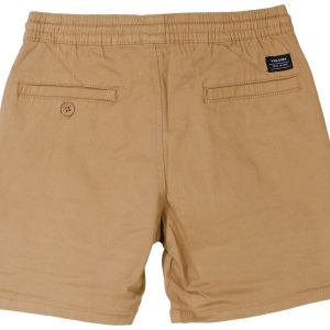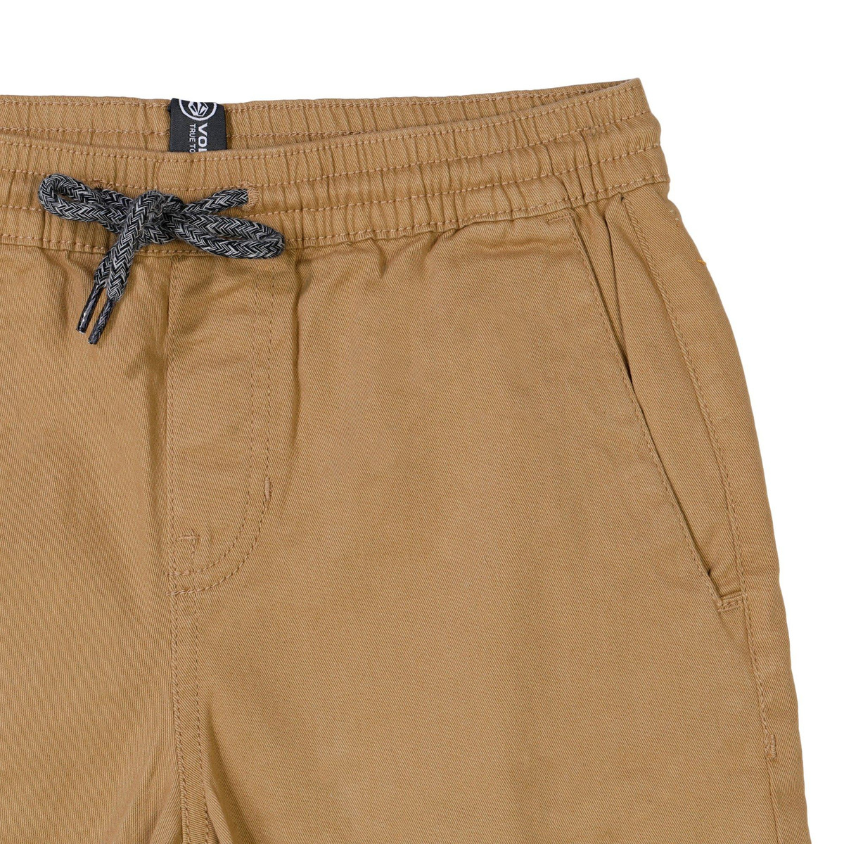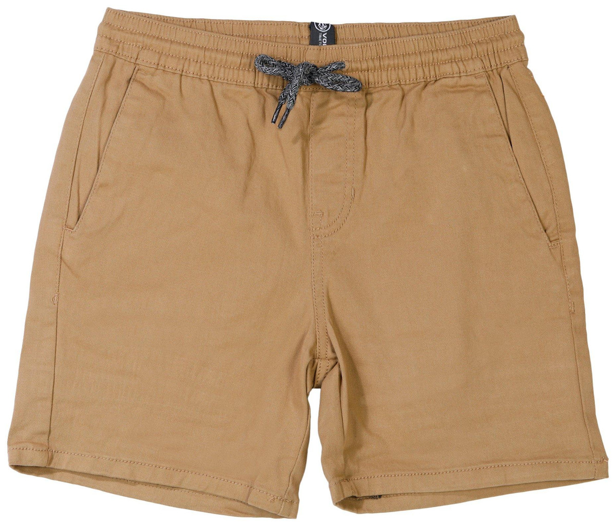 The Boys Khaki Shorts by Volcom feature an elastic drawstring waistband, flat front, and signature asymmetric back yoke for standout style. Designed with 2 side pockets, 1 back pocket, and 1 welt pocket with woven label. Made from cotton, recycled polyester, elastane, and stretch twill for comfort and flexibility. 13 inch outseam. Machine wash and tumble dry.