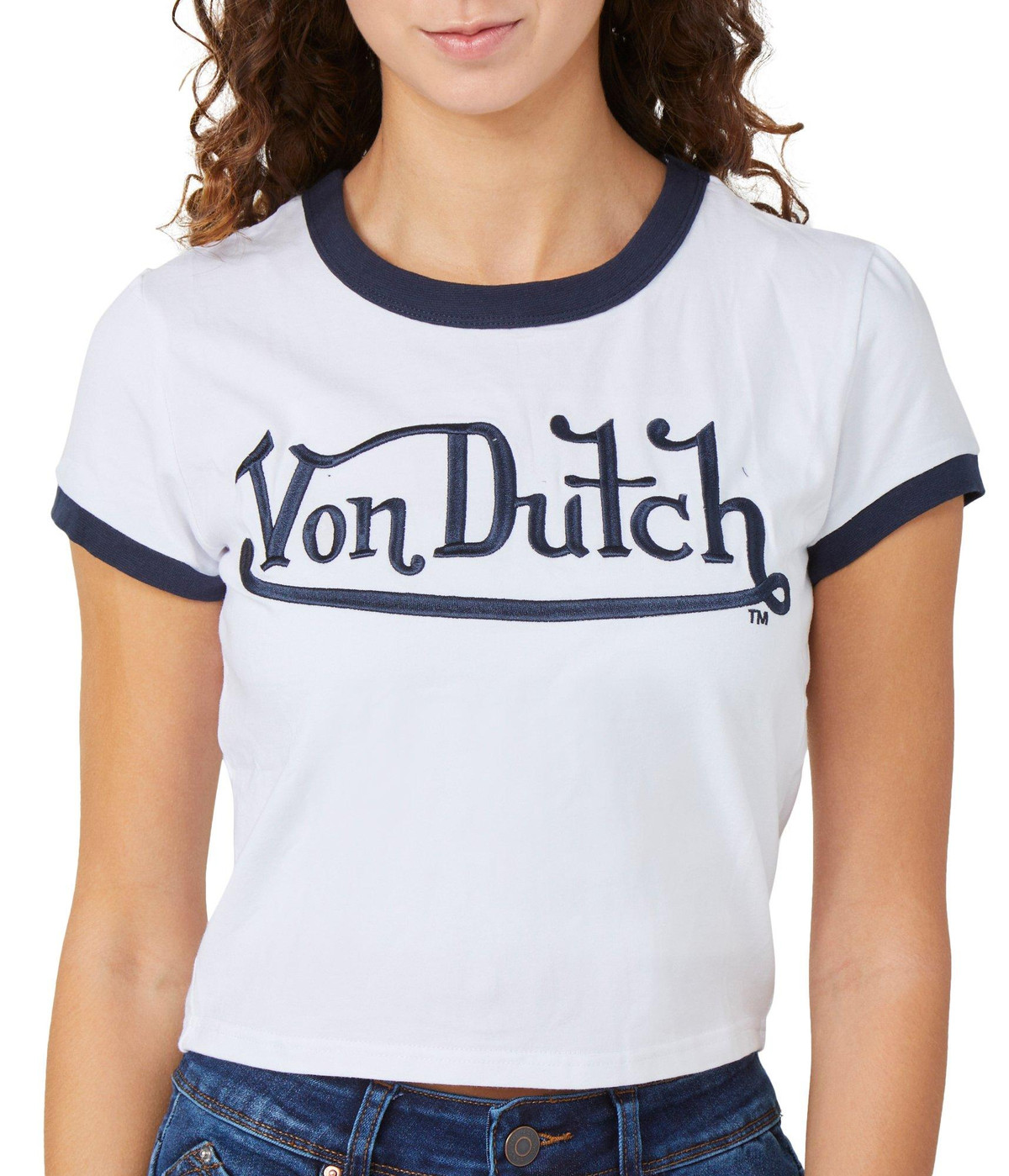 Keep it cool and classic with the Juniors Ringer Baby Tee. Featuring a cropped fit, embroidered logo script, and contrast navy piping on the crew neckline and short sleeves, this tee brings a sporty-chic vibe to your everyday look. Fabrication 95% cotton, 5% spandex