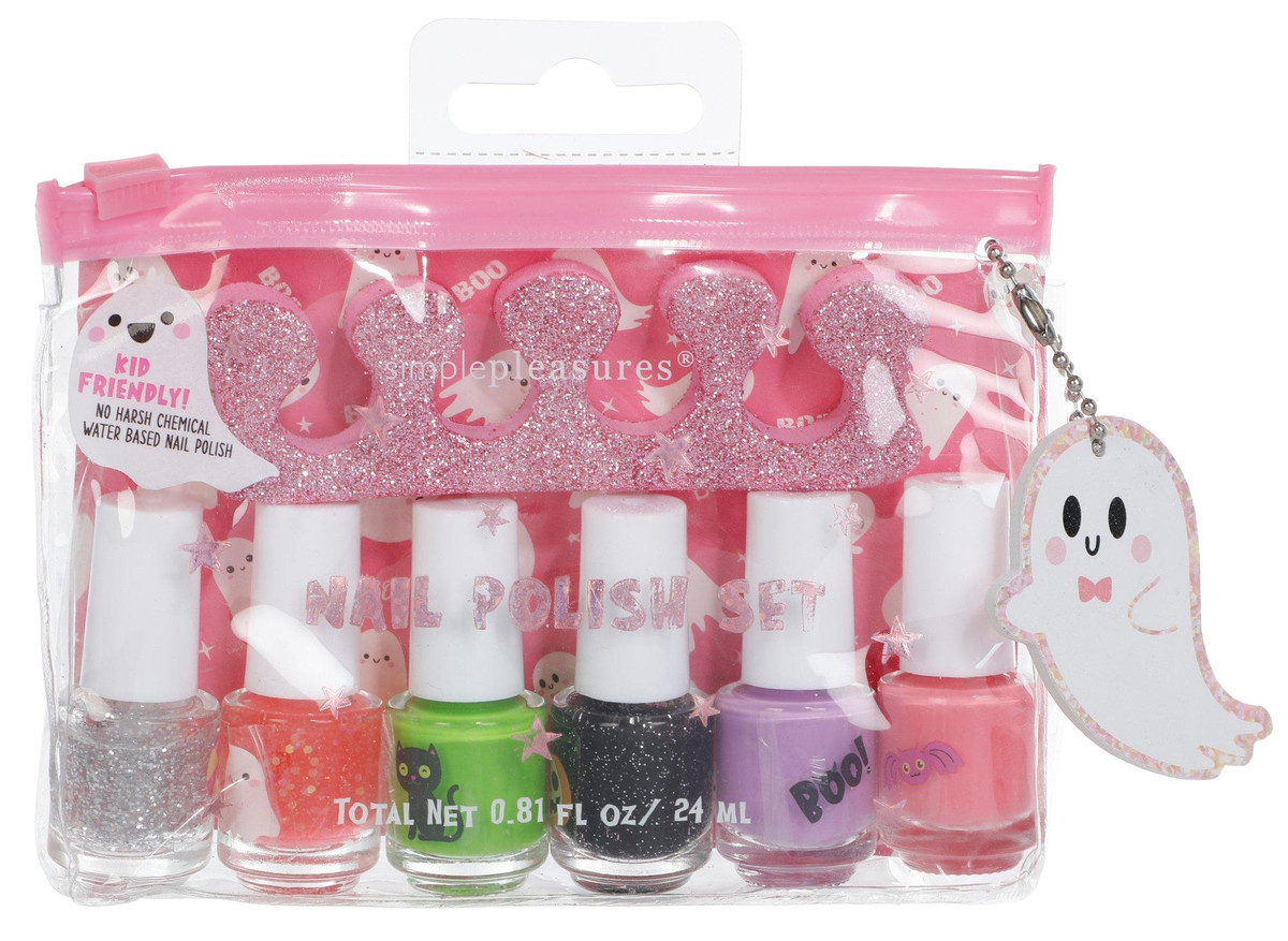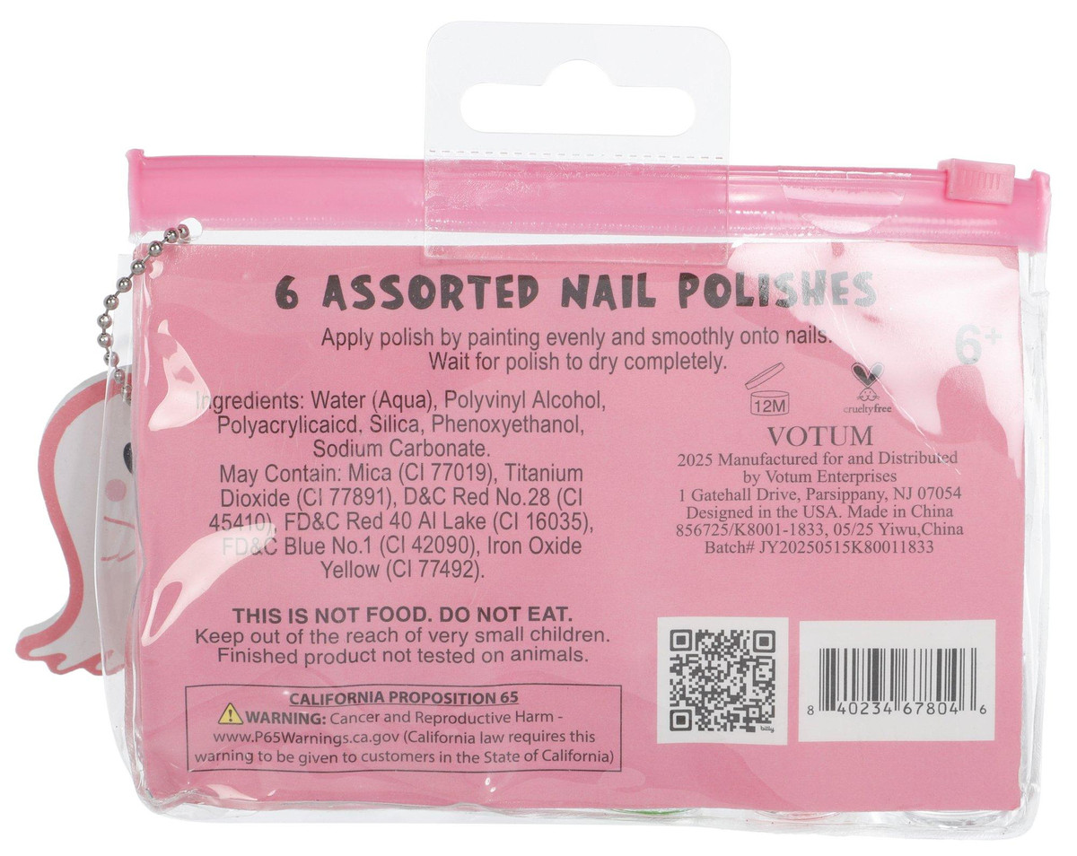 Complete her festive look with this 6 Pc Halloween Nail Polish Set. Featuring a variety of Halloween-inspired shades, each polish is formulated for safe use and easy application. Perfect for costume parties, seasonal fun, or creative play. Recommended for ages 6 and up. Store in a cool, dry place when not in use.