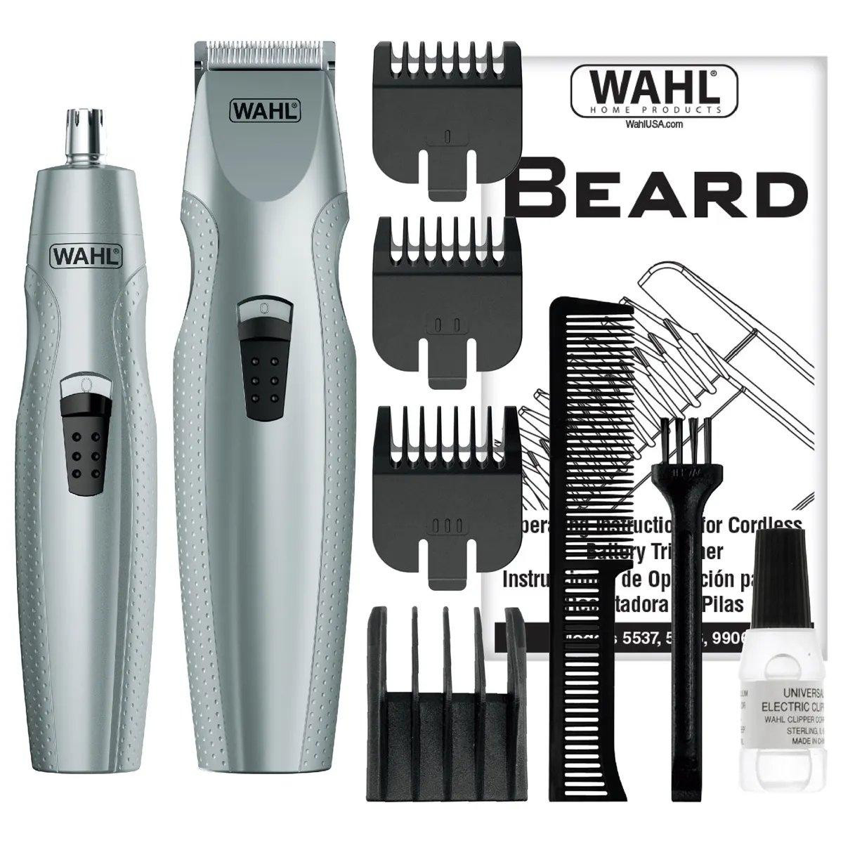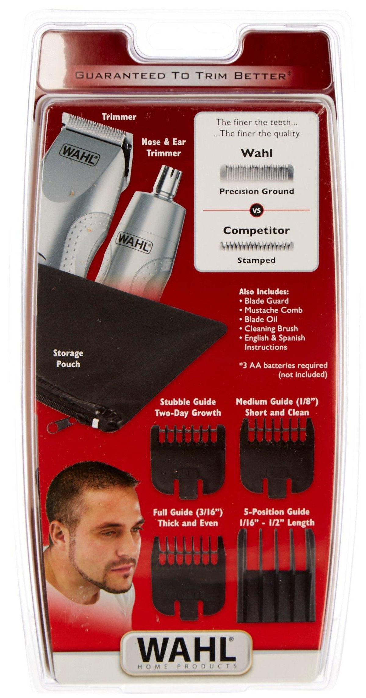 This 12 piece trimmer from Wahl is guaranteed to trim better, with 5-position, stubble, medium, & full guides. Includes a nose/ear trimmer and precision trimmer. With blade guard, mustache comb, blade oil, cleaning brush, & instructions. 3 AA batteries requires (not included).