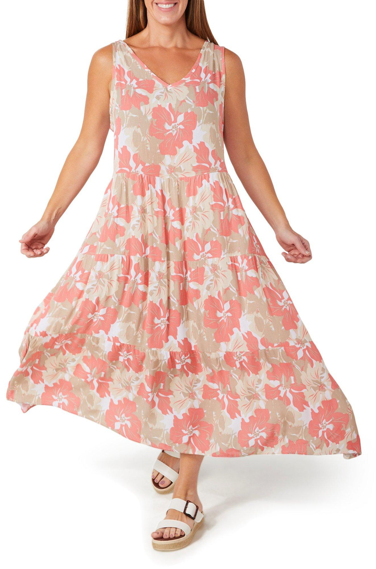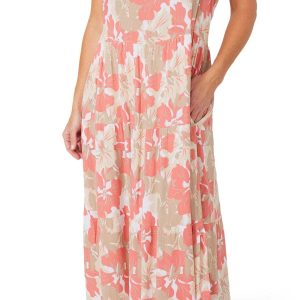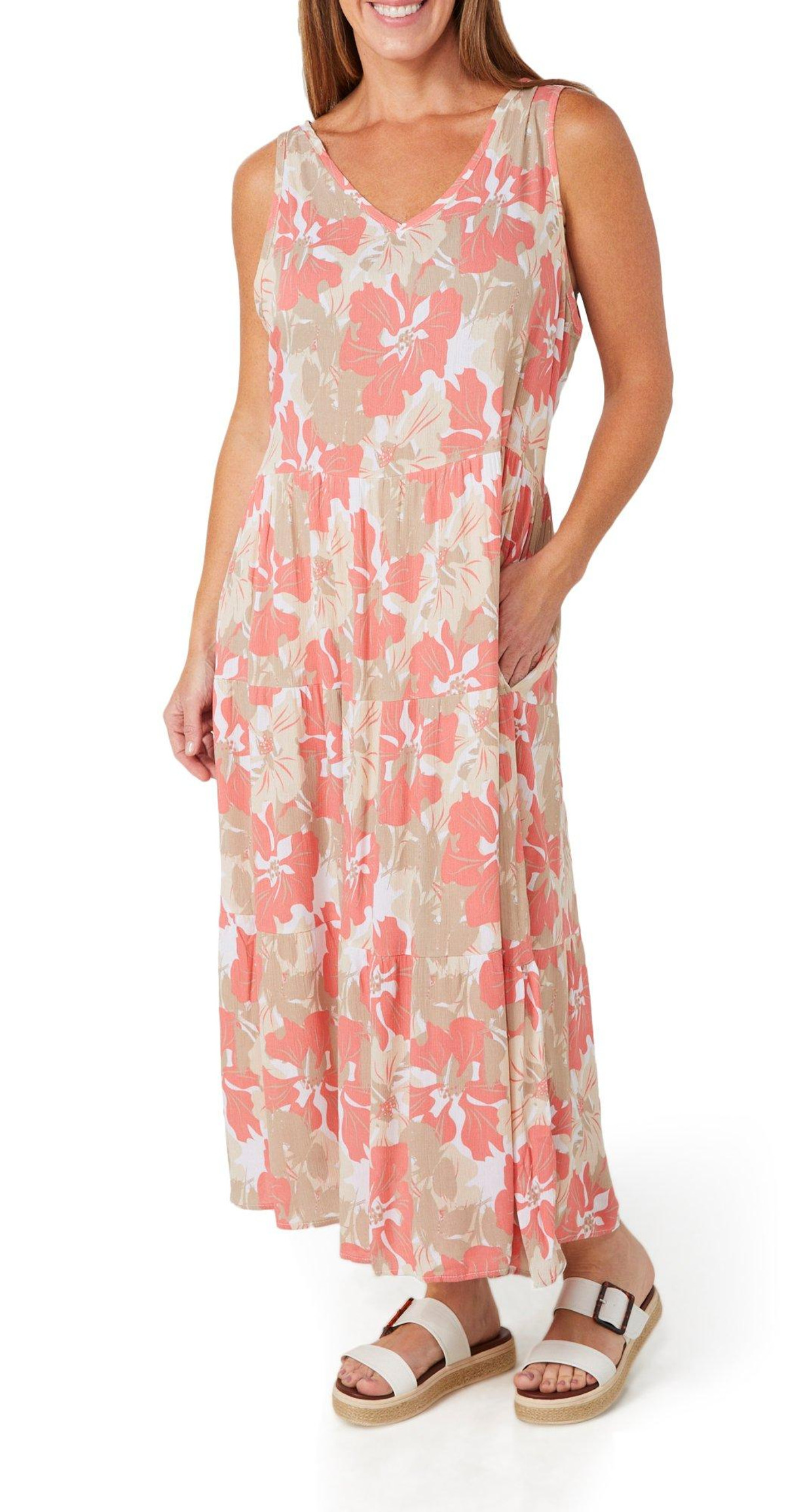 Introducing this Sleeveless Floral Maxi Dress, crafted from 100% rayon for a soft and breathable feel. This elegant dress features a stylish floral design and a flattering V neckline. With a modest maxi length, it offers a sophisticated silhouette perfect for any occasion. Embrace the season with this chic and versatile addition to your wardrobe!