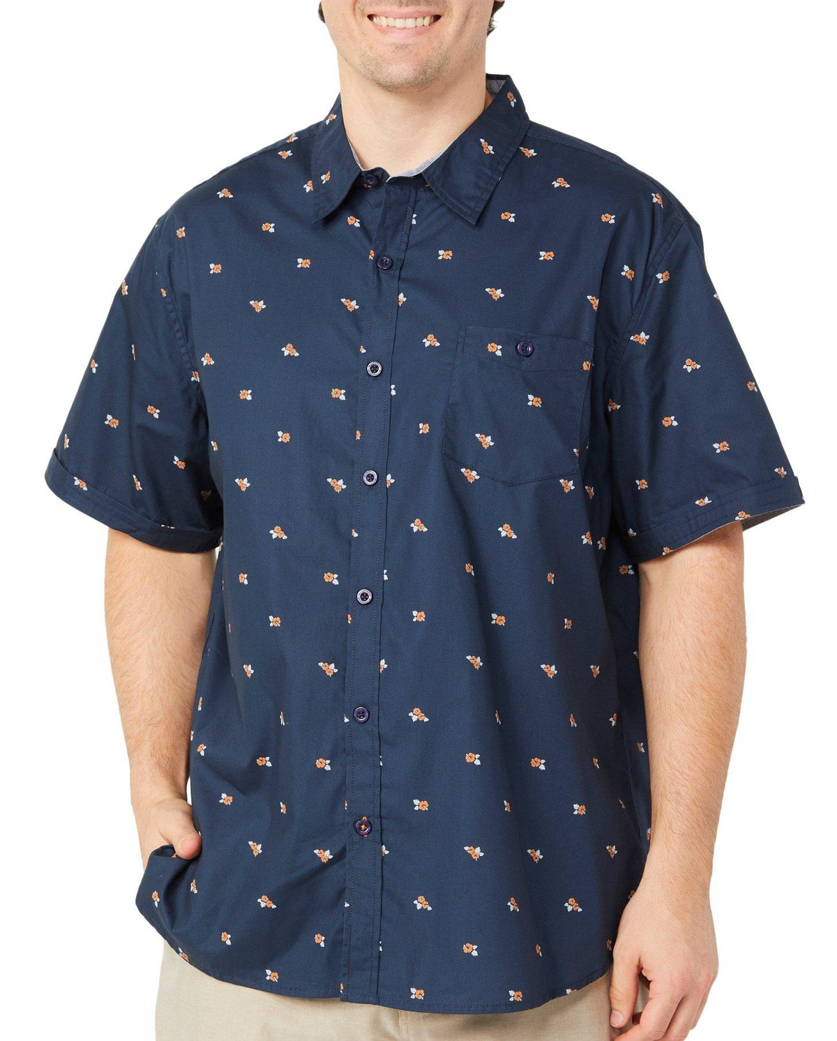 This men’s polo features a button down design, chest pocket, all cotton fabric, and an allover flower print. Built for breathable comfort and casual style.
