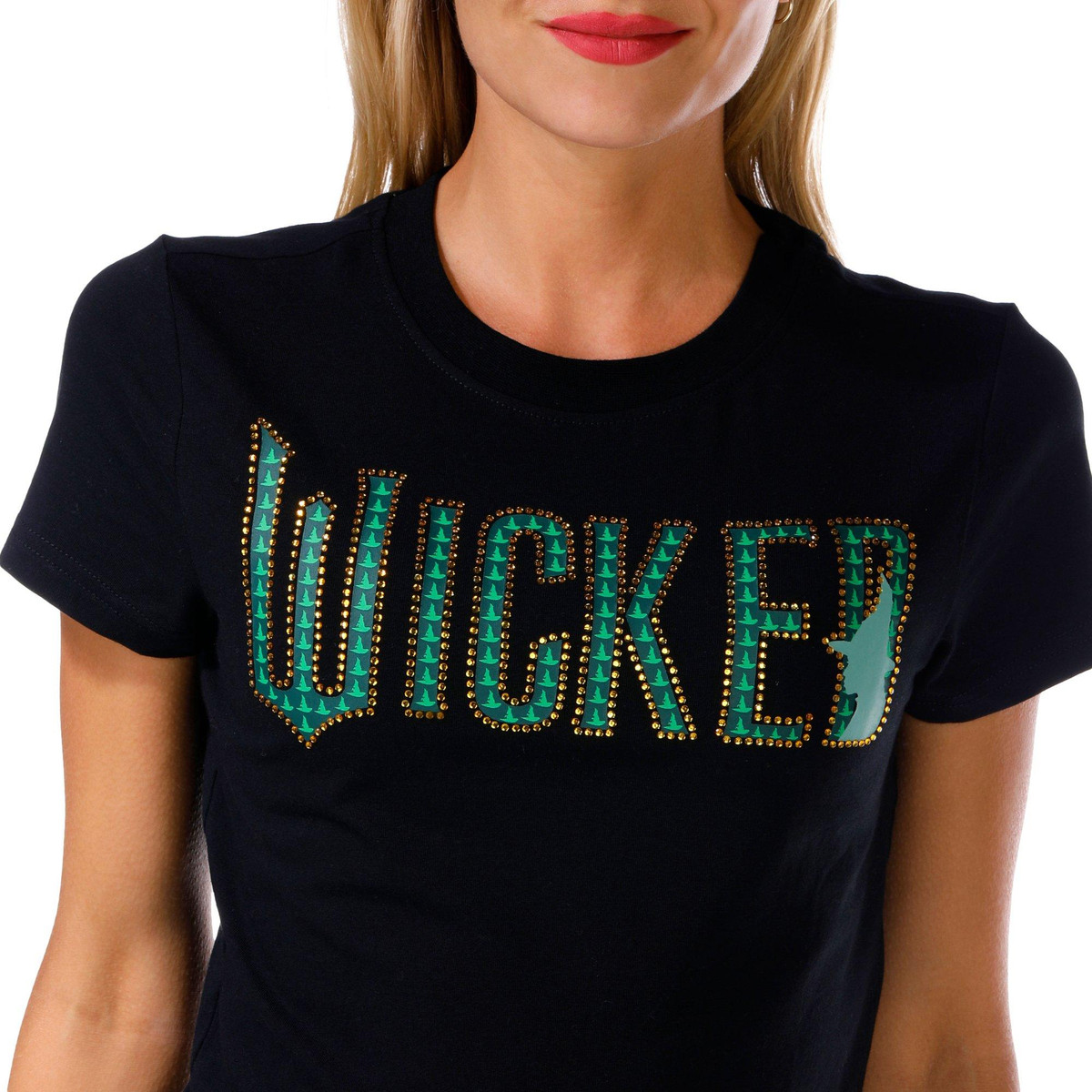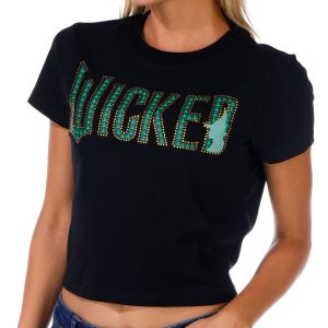 This juniors baby tee features a classic crew neckline and short sleeves with a bold embellished Wicked script across the front. A fun and edgy piece that adds personality to any casual outfit. Fabrication 95% cotton, 5% spandex