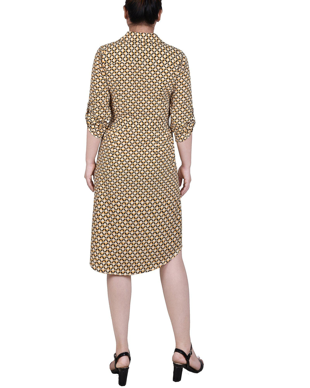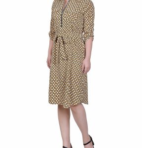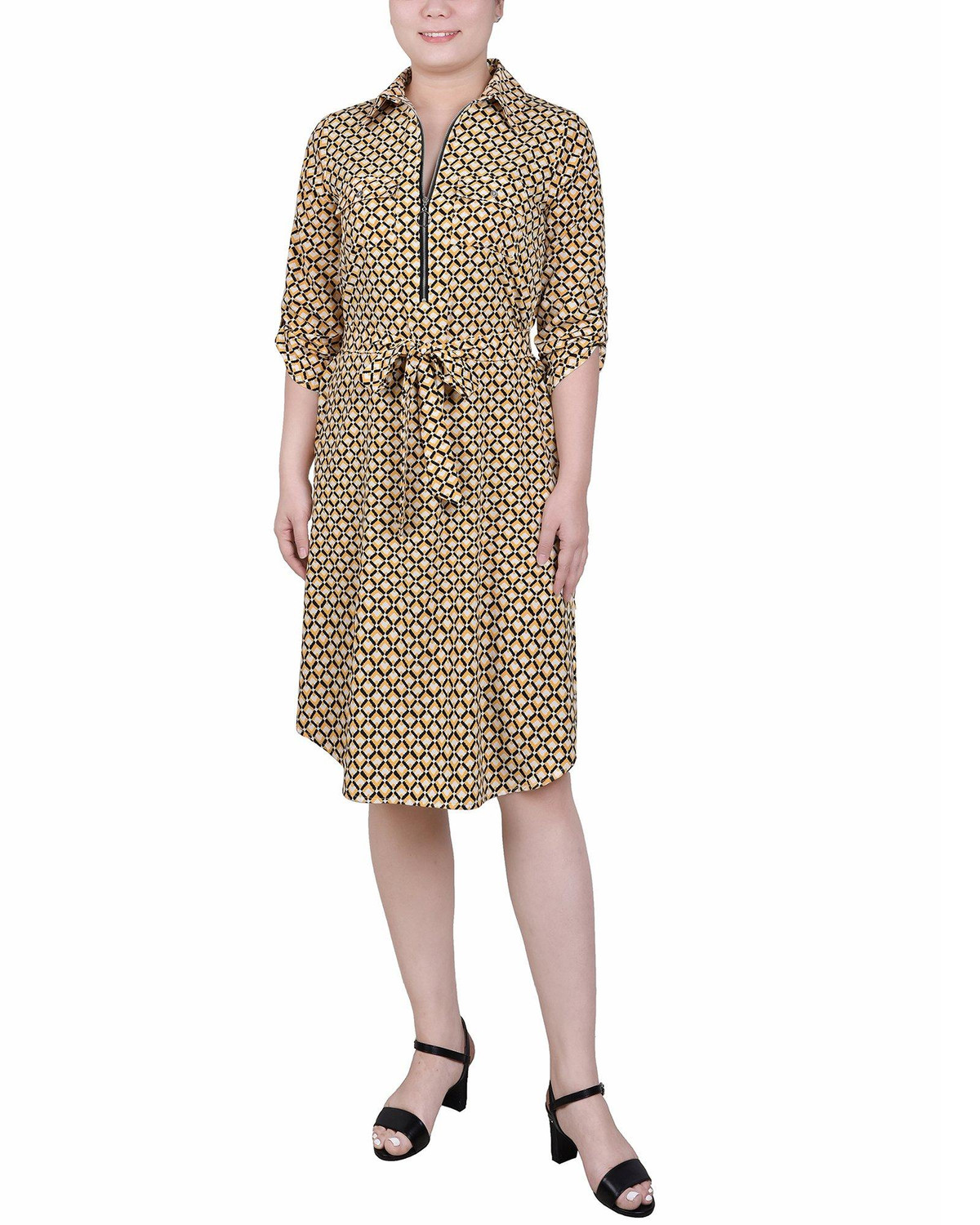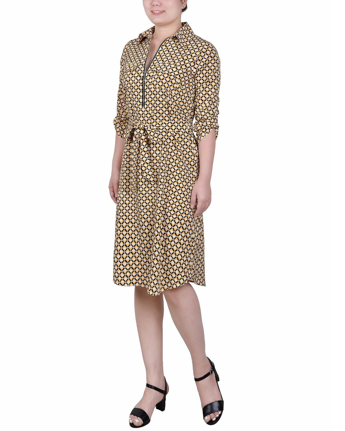 This updated Petite shirtdress from NY Collection has a zip front and roll tab sleeves. The self tie belt completes the look.