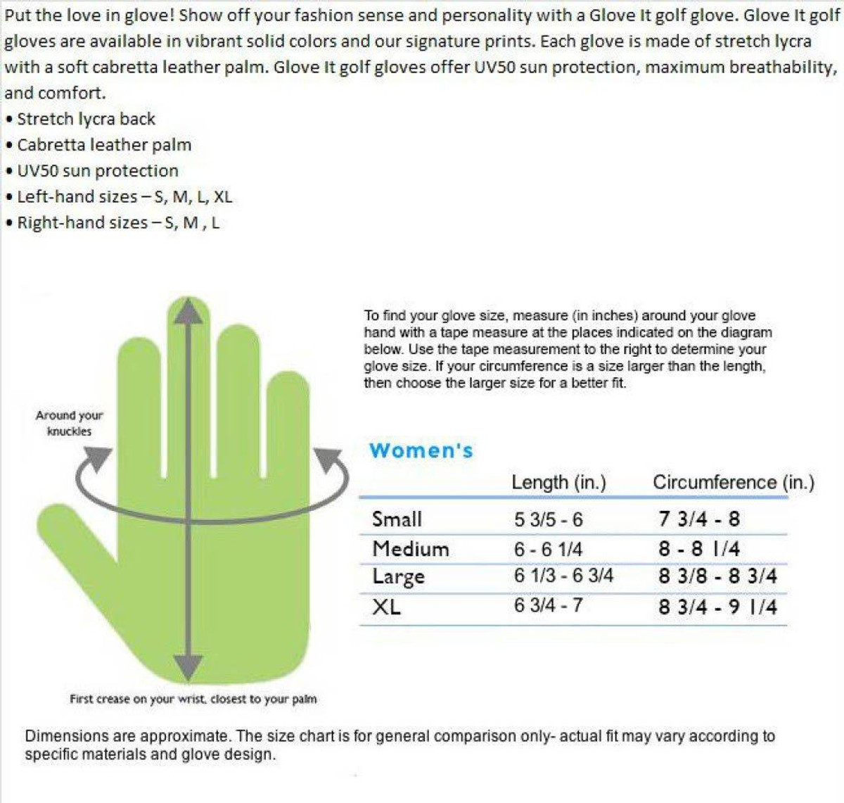 Put the love in glove! Show off your fashion sense and personality with the Sea Glass Glove It golf glove. Glove It golf gloves are available in vibrant solid colors and our signature prints. Each glove is made of stretch lycra with a soft cabretta leather palm. Glove It golf gloves offer UV50 sun protection, maximum breathability, and comfort.