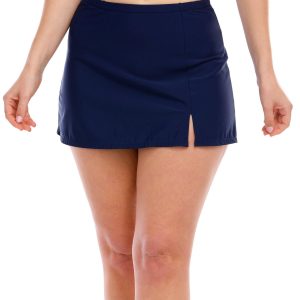 This Maxine of Hollywood wide band skort swim bottom is a versatile addition to your swimwear collection. This full-coverage swim skort features flattering tummy toner to discreetly conceal unwanted excess.. The skirt length measures approximately 13 in. Fabrication 82% nylon, 18% Lycra Xtra Life elastane.