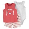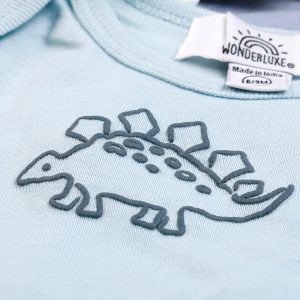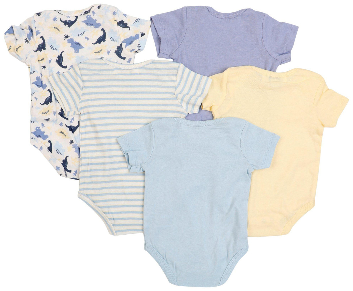Add prehistoric charm to your babys wardrobe with this 5-pack of dinosaur-themed short sleeve bodysuits. Each features fun, assorted prints and patterns, soft knit fabric, and a comfy fit. Designed with overlapping shoulders for easy on and off, plus a secure three-snap bottom closure for quick diaper changes. These bodysuits are as practical as they are playful. Fabrication is 60% cotton, 40% polyester. Length measures approximately 14 in.