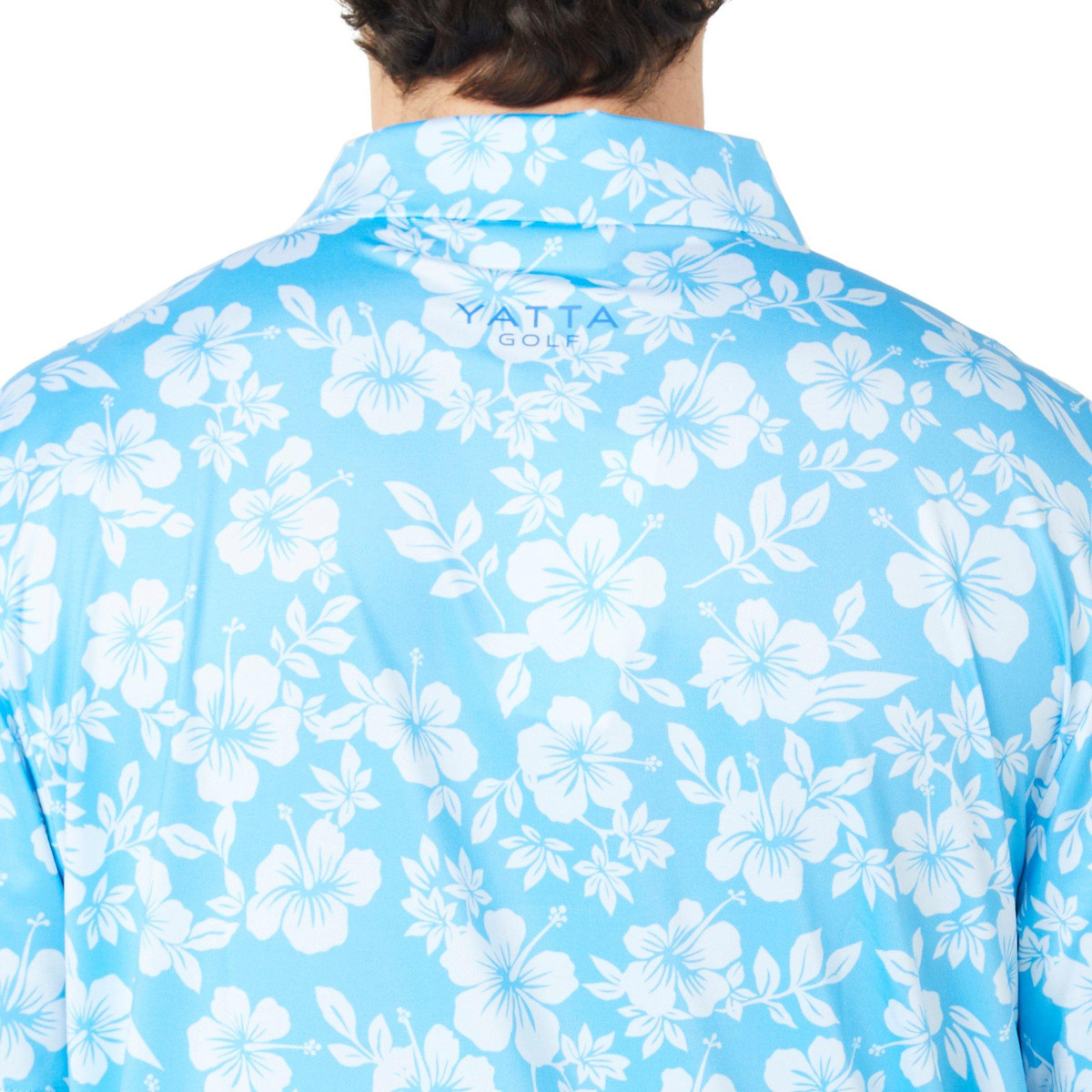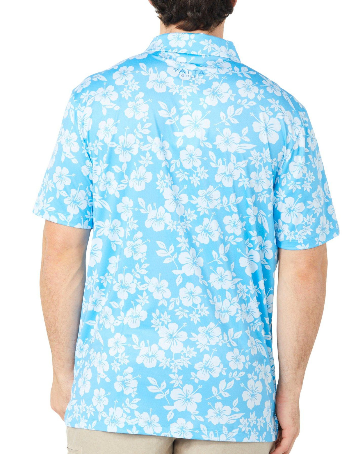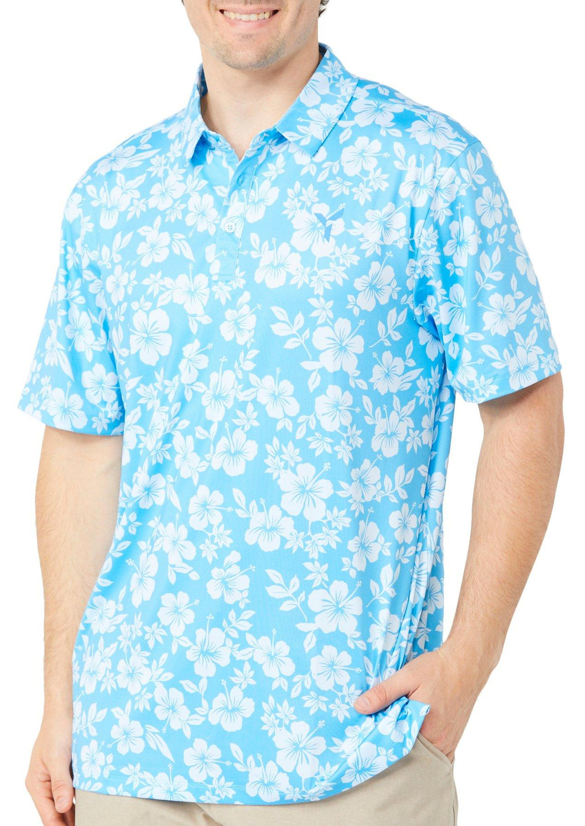 This men’s polo features soft, stretchy fabric with an allover Hawaiian flower print. Designed for comfort and vibrant style from casual outings to coastal escapes. Fabrication is 95% polyester and 5% spandex.