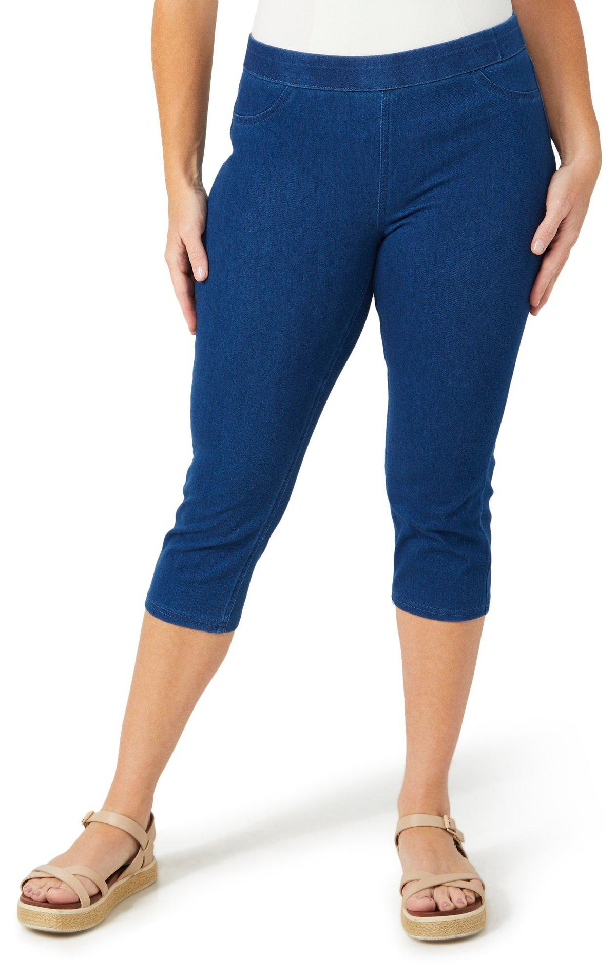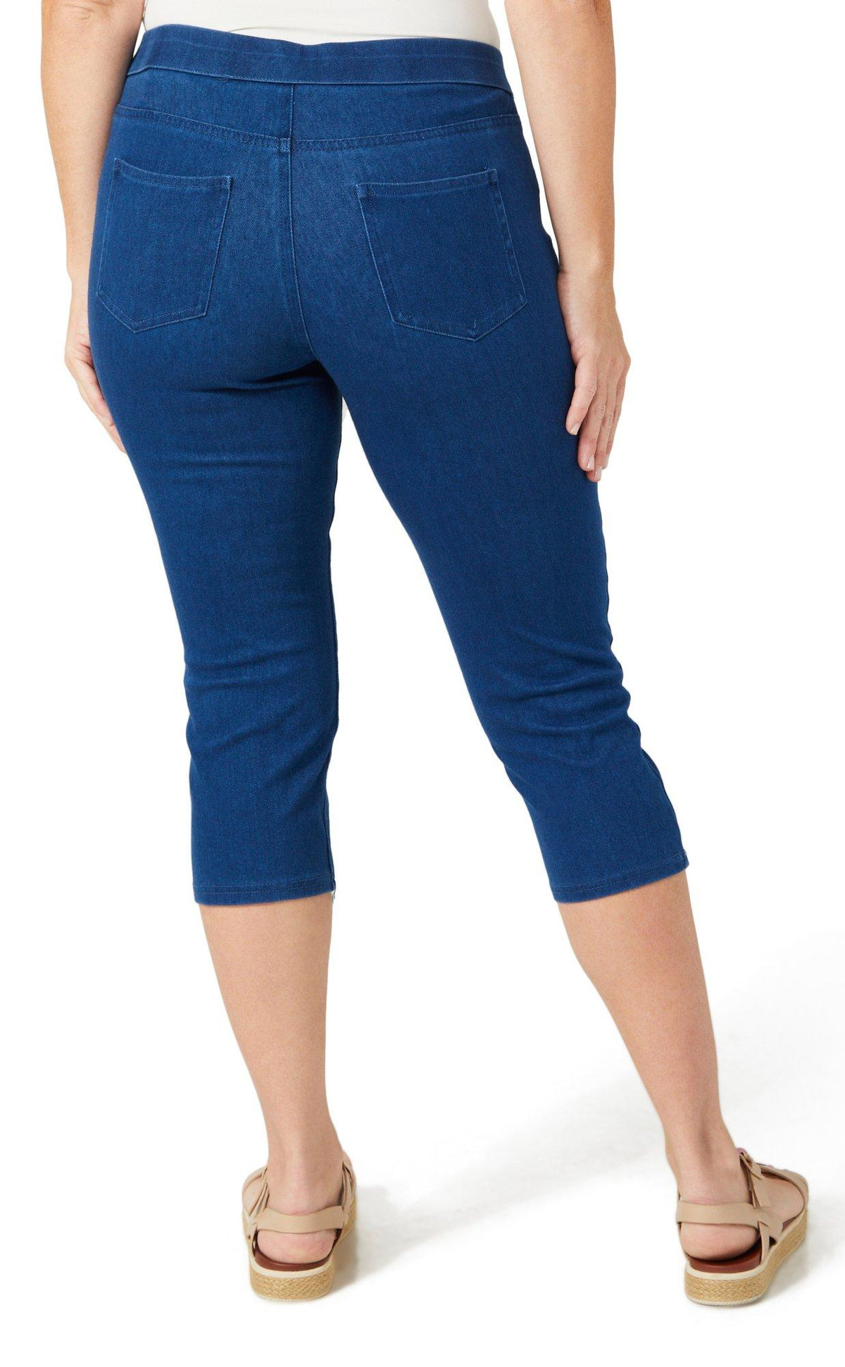 Flatter your figure in these slim crop denim capris, designed with a comfy elastic waistband and strategically placed back pockets for a sleek, streamlined look. The slimming fit hugs in all the right places, offering effortless style and all day comfort, perfect for dressing up or down with ease. Fabrication is 53% cotton, 32% polyester, 15% spandex.