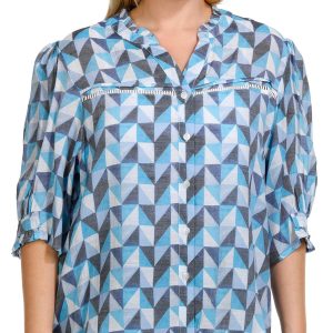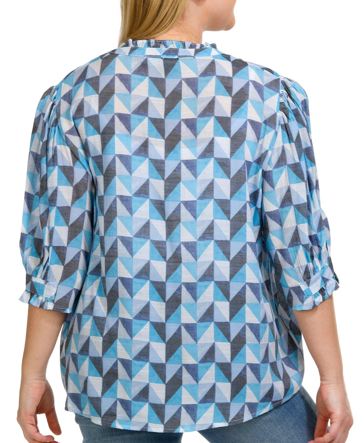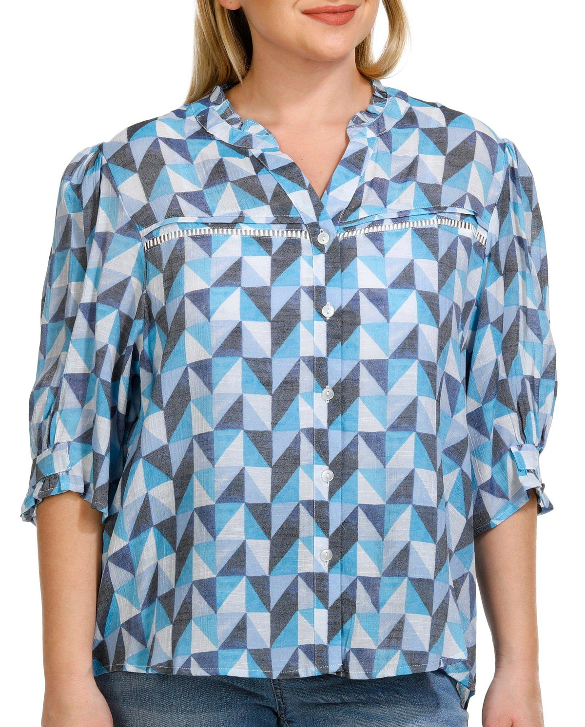 Enhance your wardrobe with our 3/4 Sleeve Top. Featuring a striking geo print pattern, this top adds a modern and vibrant touch to any outfit. The crochet inset details provide a delicate and intricate design, while the ruffle neckline adds a feminine flair. The buttoned front offers classic styling, making it perfect for both casual and dressy occasions. Fabrication is 65% rayon and 35% polyester.