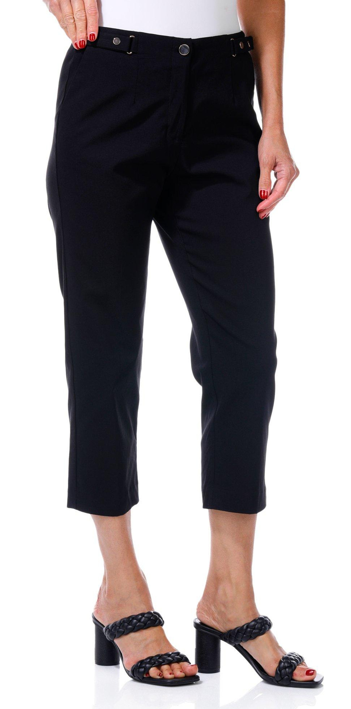 Step into stylish comfort with these Slim Crop. Designed with a flattering cropped length, these pants elevate any casual look. The gold button waist trim adds a refined touch of elegance. Inseam measures approximately 22 in. With 2 functional front pockets. Fabrication is 76% rayon, 21% nylon, and 3% spandex with trim made from 100% cotton.