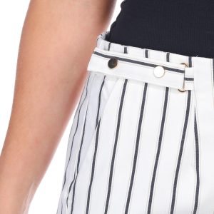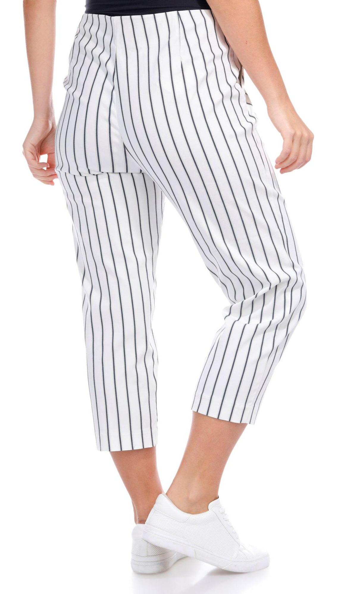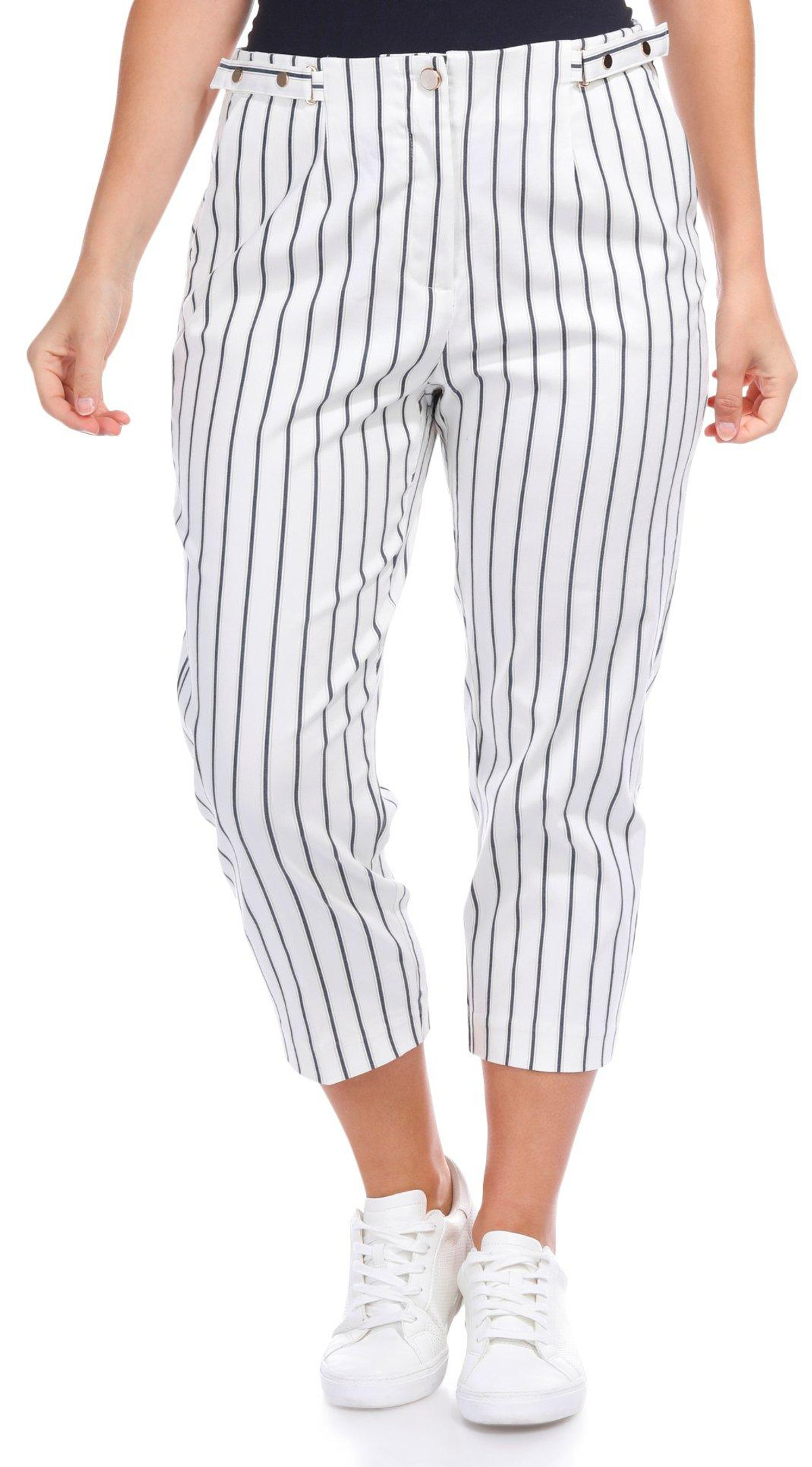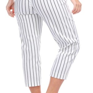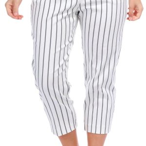 These womens pants feature a striped print with a slim leg fit and 23 inch inseam for a sleek modern look. Made of nylon rayon and spandex they offer stretch and comfort with a button fly zip closure for a polished finish.