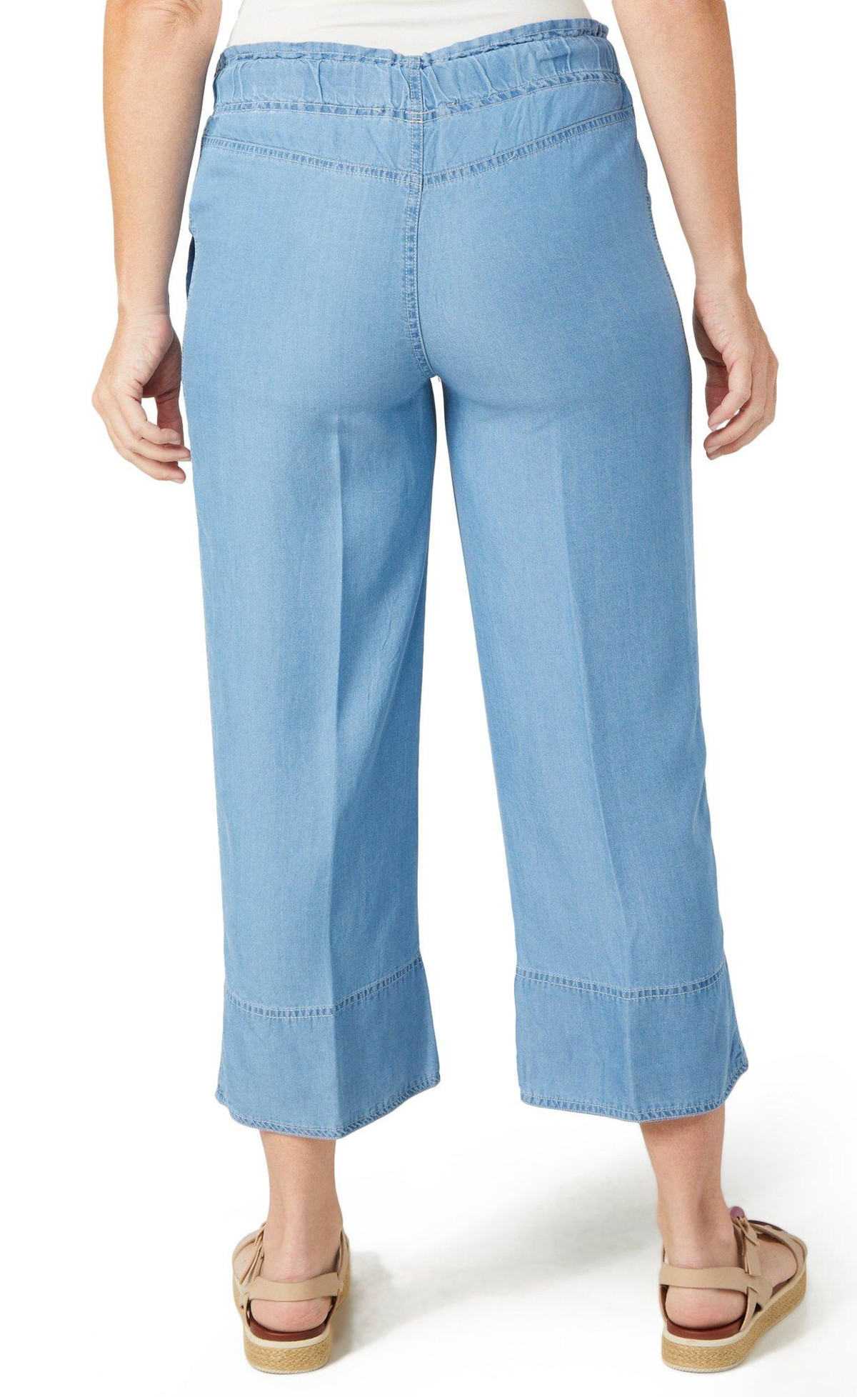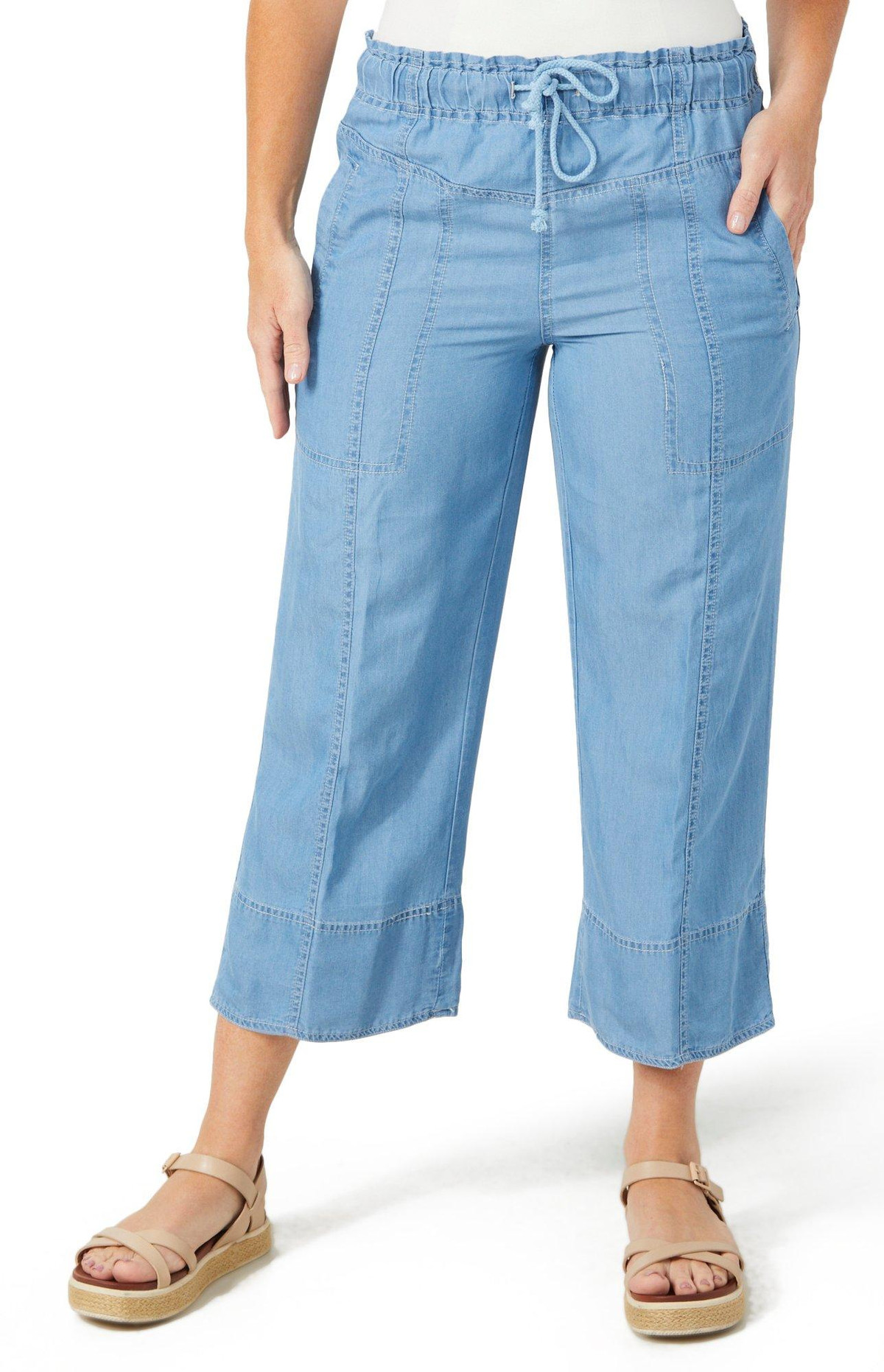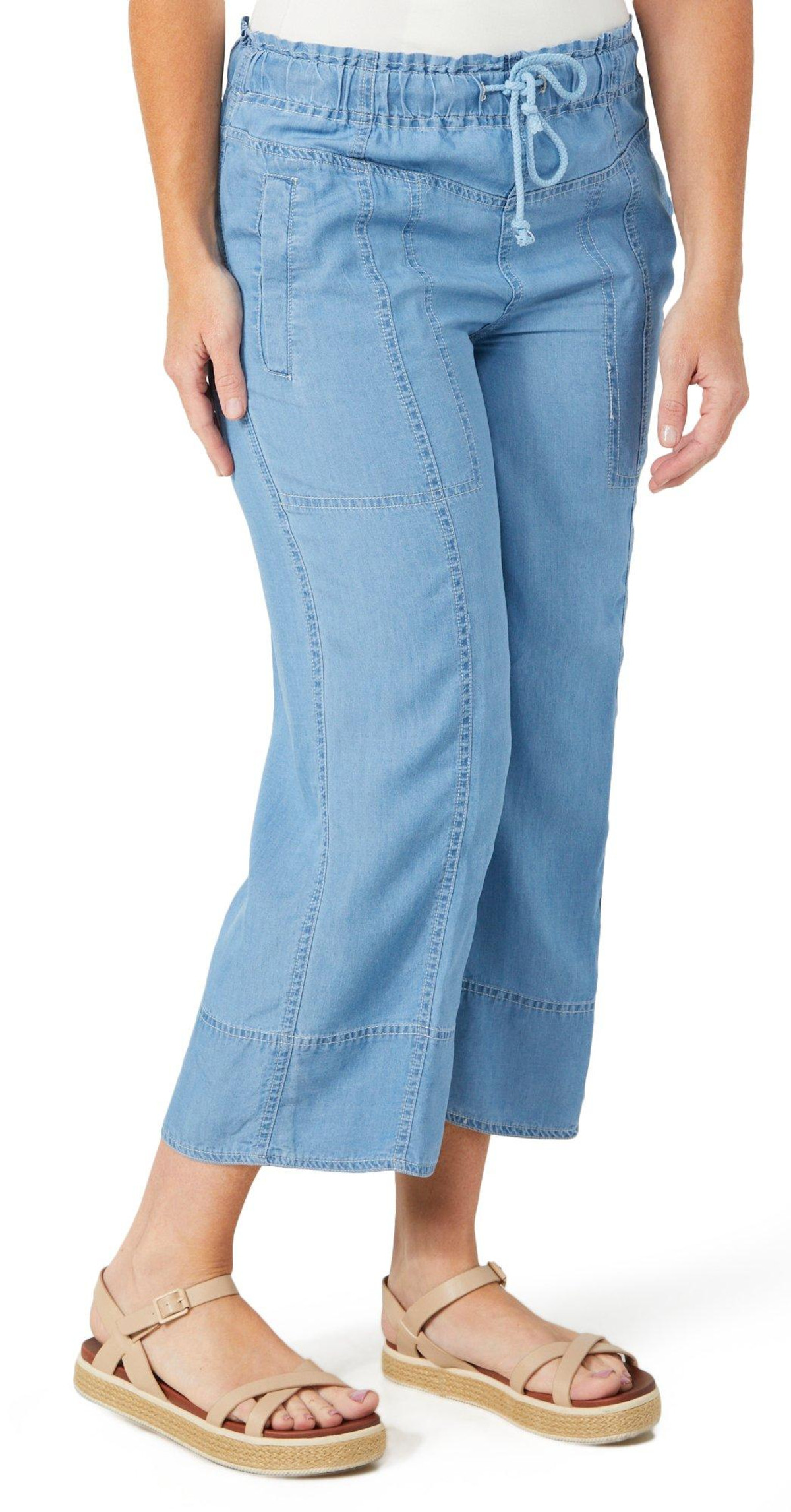 Breeze through your day in these wide leg denim capris, designed with a relaxed drawstring waist and double front pockets for easygoing style. The flowy silhouette adds a modern twist to classic denim, offering comfort, versatility, and a laid back vibe perfect for warm weather adventures. Inseam measures approximately 24 in.