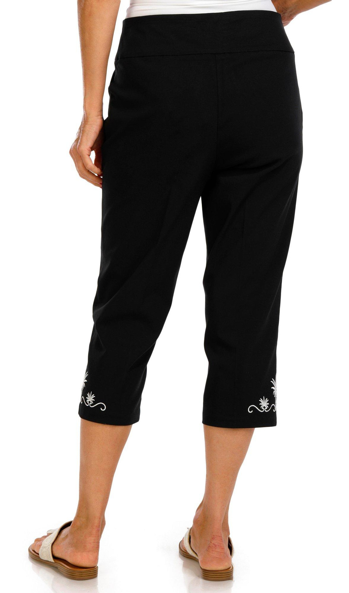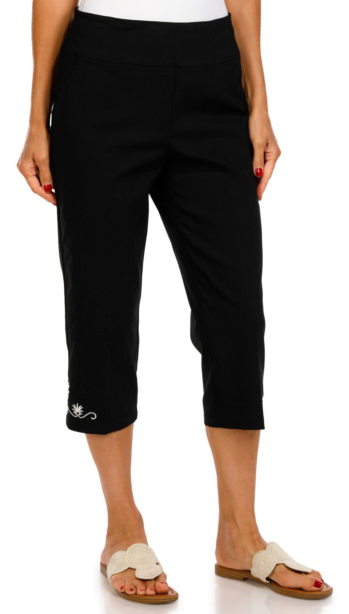 These women’s crop pants feature a pull on waistband and a solid color with an embroidered hem. With a straight leg cut, they offer a comfortable fit and a touch of detail for a polished everyday look.